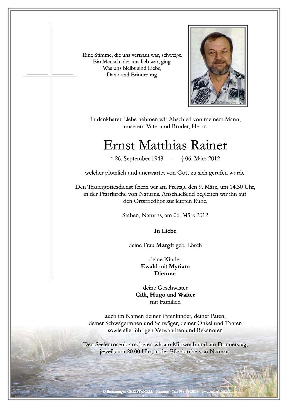 Den Trauergottesdienst feiern wir am Freitag, den 9. März, um 14.30 Uhr, in der Pfarrkirche von Naturns. Anschließend begleiten wir ihn auf den Ortsfriedhof zur letzten Ruhe.