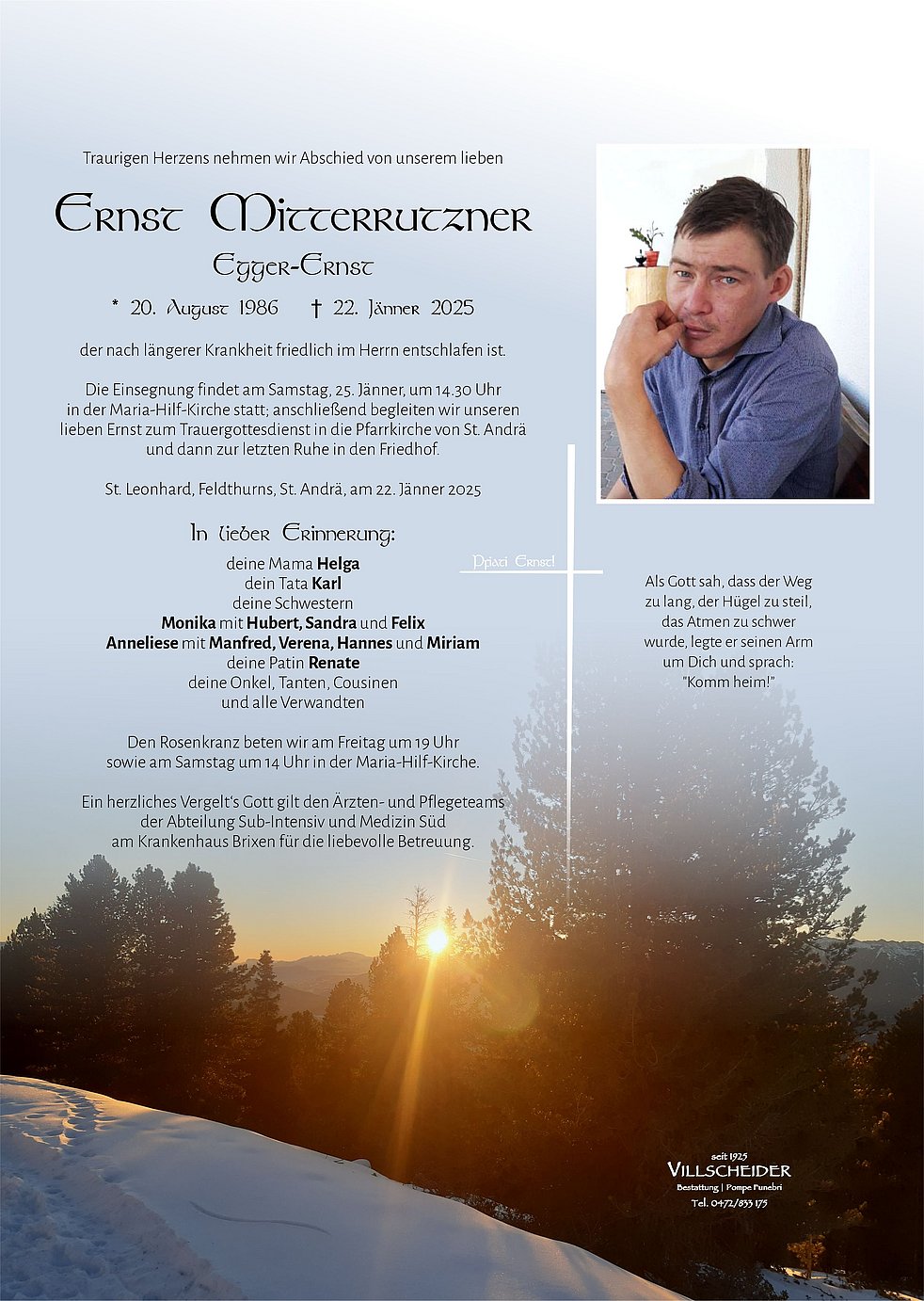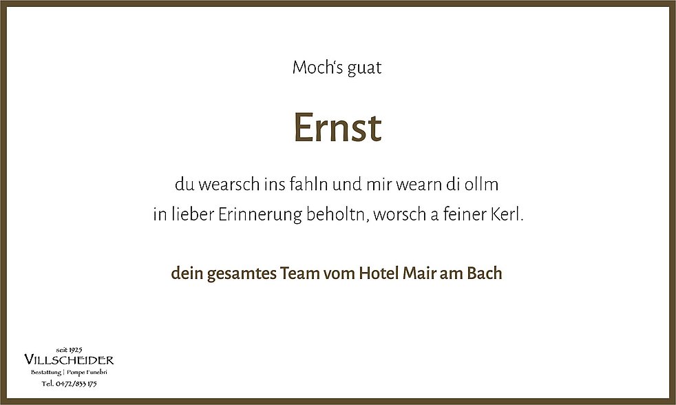 Meine, unsere, herzliche Anteilnahme zum Heimgang von Ernst, der allzufrüh von Euch gegangen ist, liebe Monika und liebe Annelies mit Familien ich wünsche Euch allen viel Kraft in der für Euch so schweren Zeit.