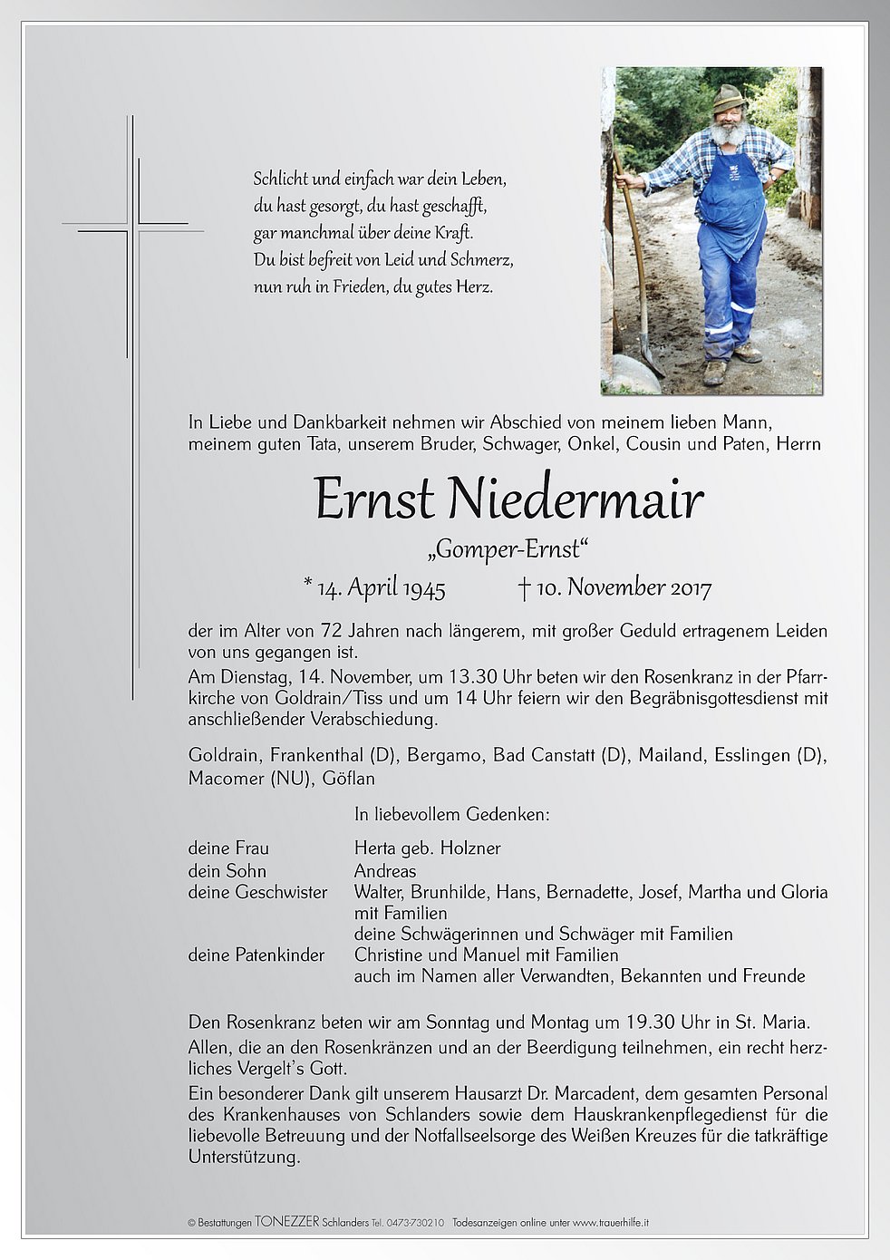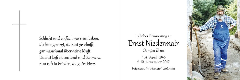 Ein besonderer Dank gilt unserem Hausarzt Dr. Marcadent, dem gesamten Personal des Krankenhauses von Schlanders sowie dem Hauskrankenpflegedienst für die liebevolle Betreuung und der Notfallseelsorge des Weißen Kreuzes für die tatkräftige Unterstützung.