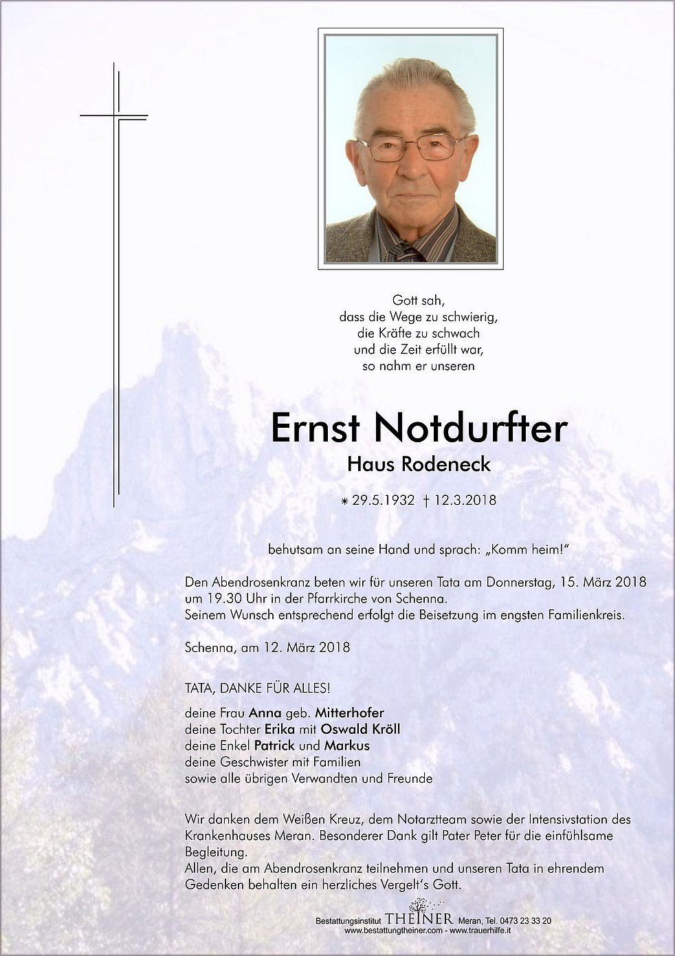 Wir danken dem Weißen Kreuz, dem Notarztteam sowie der Intensivstation des Krankenhauses Meran. Besonderer Dank gilt Pater Peter für die einfühlsame Begleitung.