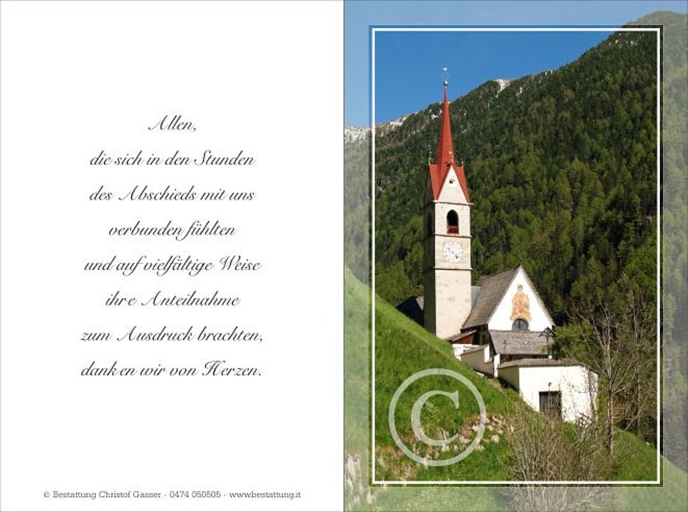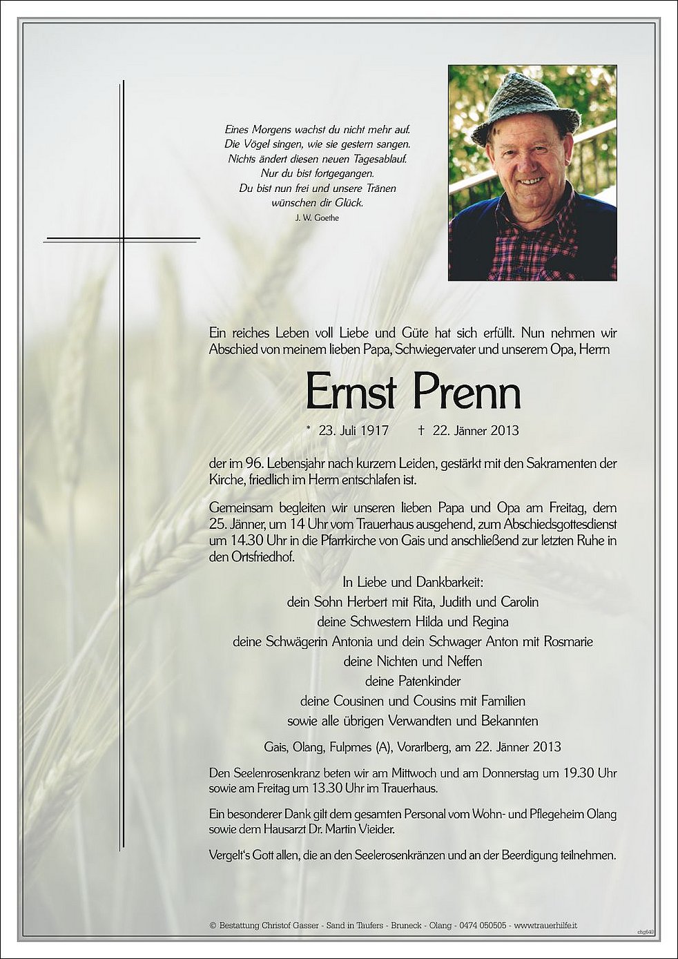 Gemeinsam begleiten wir unseren lieben Papa und Opa am Freitag, dem 25. Jänner, um 14 Uhr vom Trauerhaus ausgehend, zum Abschiedsgottesdienst um 14.30 Uhr in die Pfarrkirche von Gais und anschließend zur letzten Ruhe in den Ortsfriedhof.
