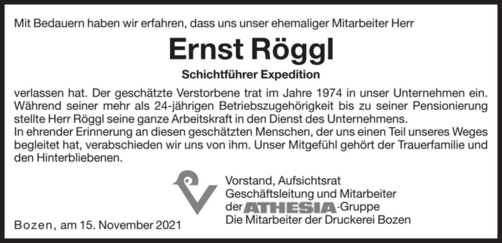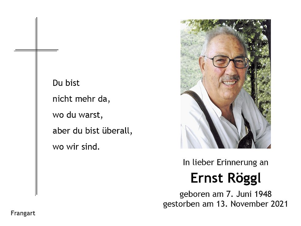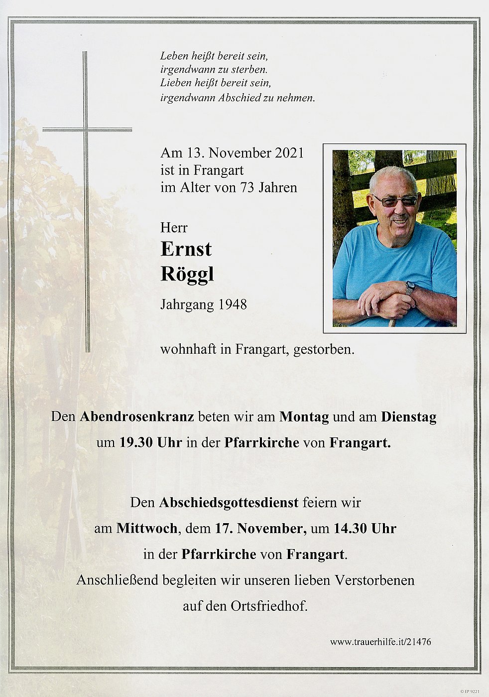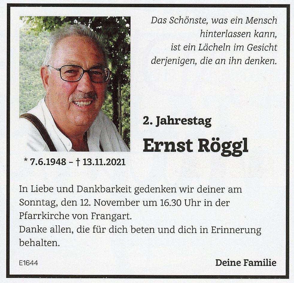 Den Abschiedsgottesdienst feiern wir am Mittwoch dem 17. November um 14.30 Uhr in der Pfarrkirche von Frangart. Anschließend begleiten wir unseren lieben Ernst auf den Ortsfriedhof.