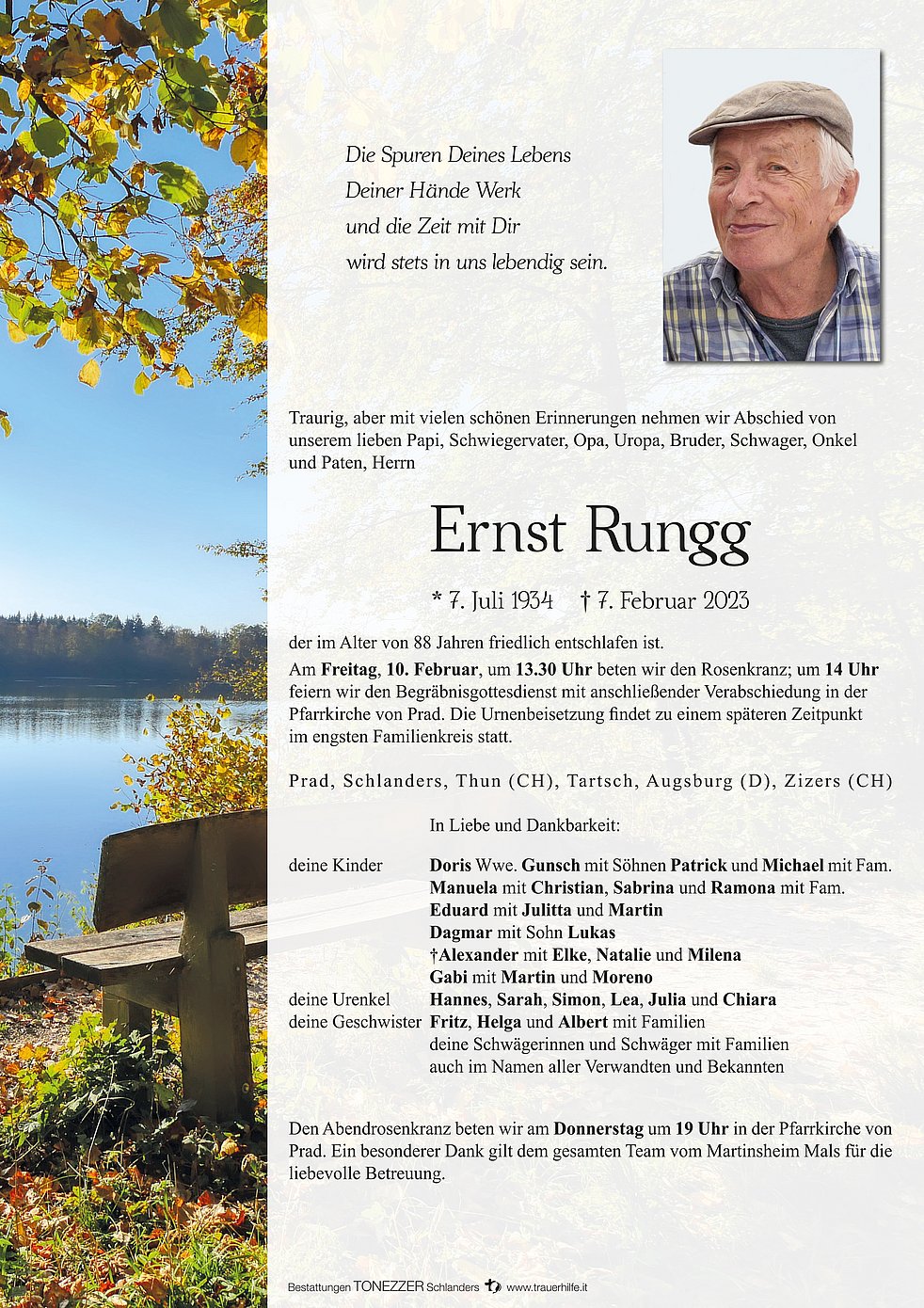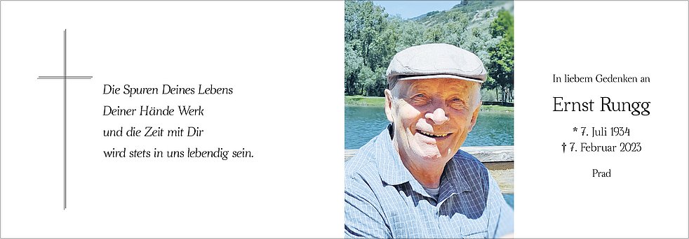 Am Freitag, 10. Februar, um 13.30 Uhr beten wir den Rosenkranz; um 14 Uhr feiern wir den Begräbnisgottesdienst mit anschließender Verabschiedung in der Pfarrkirche von Prad.