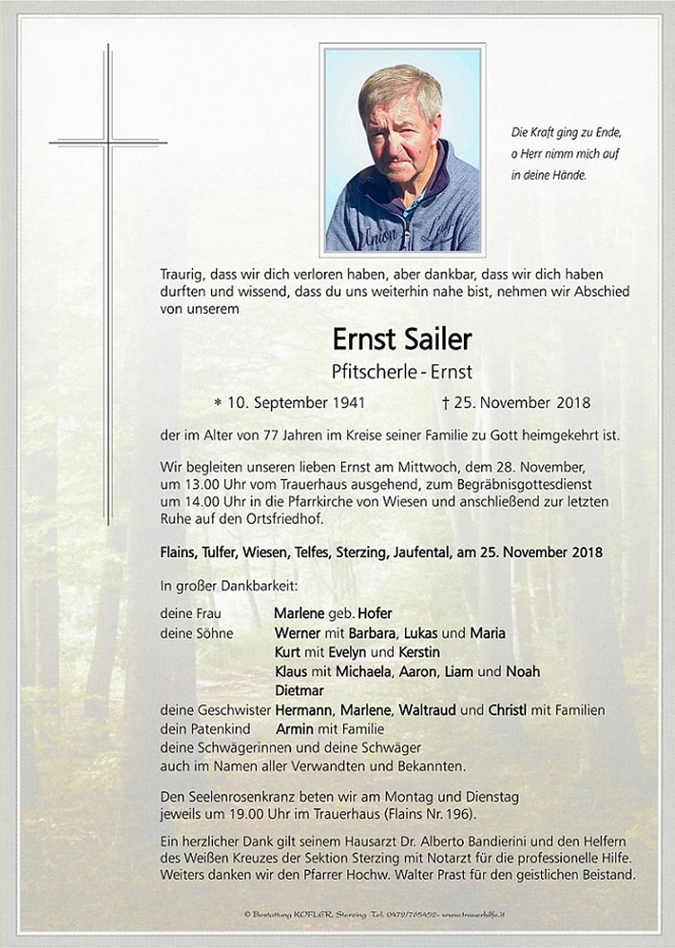 Ein herzlicher Dank gilt seinem Hausarzt Dr. Alberto Bandierini und den Helfern des Weißen Kreuzes der Sektion Sterzing mit Notarzt für die professionelle Hilfe. Weiters danken wir den Pfarrer Hochw. Walter Prast für den geistlichen Beistand.