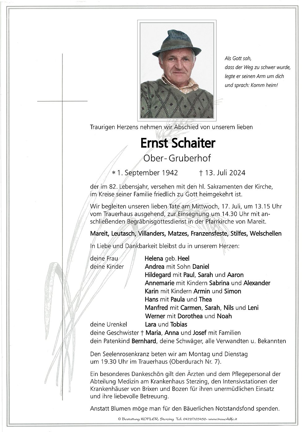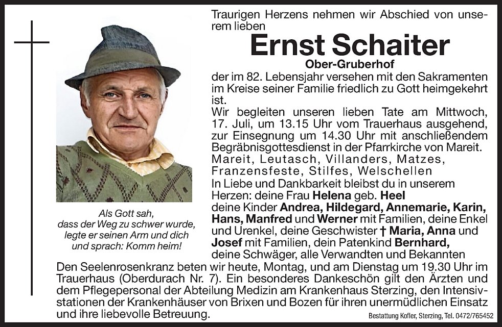 Wir begleiten unseren lieben Tate am Mittwoch, 17. Juli, um 13.15 Uhr vom Trauerhaus ausgehend, zur Einsegnung um 14.30 Uhr mit anschließenden Begräbnisgottesdienst in der Pfarrkirche von Mareit.