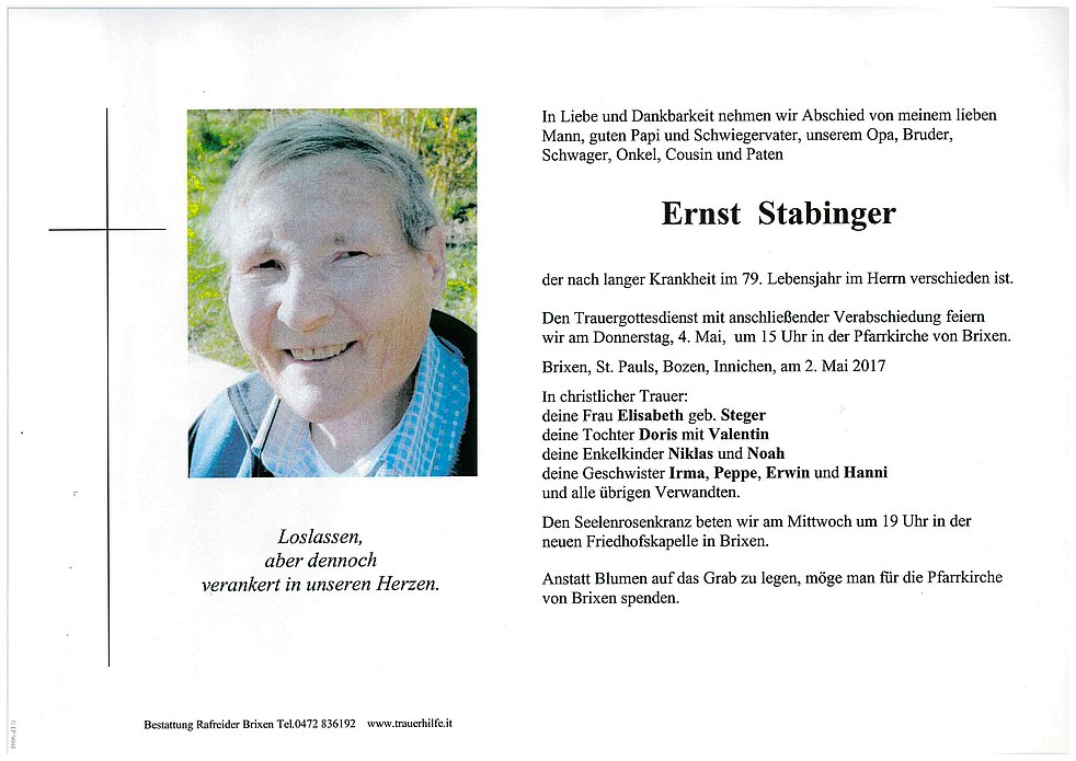 Gedankt sei den Hausärzten Dr. Engl, Dr. Perkmann und dem Pflegepersonal des Bürgerheimes von Brixen, 2. Wohnbereich, für die liebevolle Betreuung und Begleitung sowie allen die am Rosenkranz und an der Verabschiedung teilnehmen.