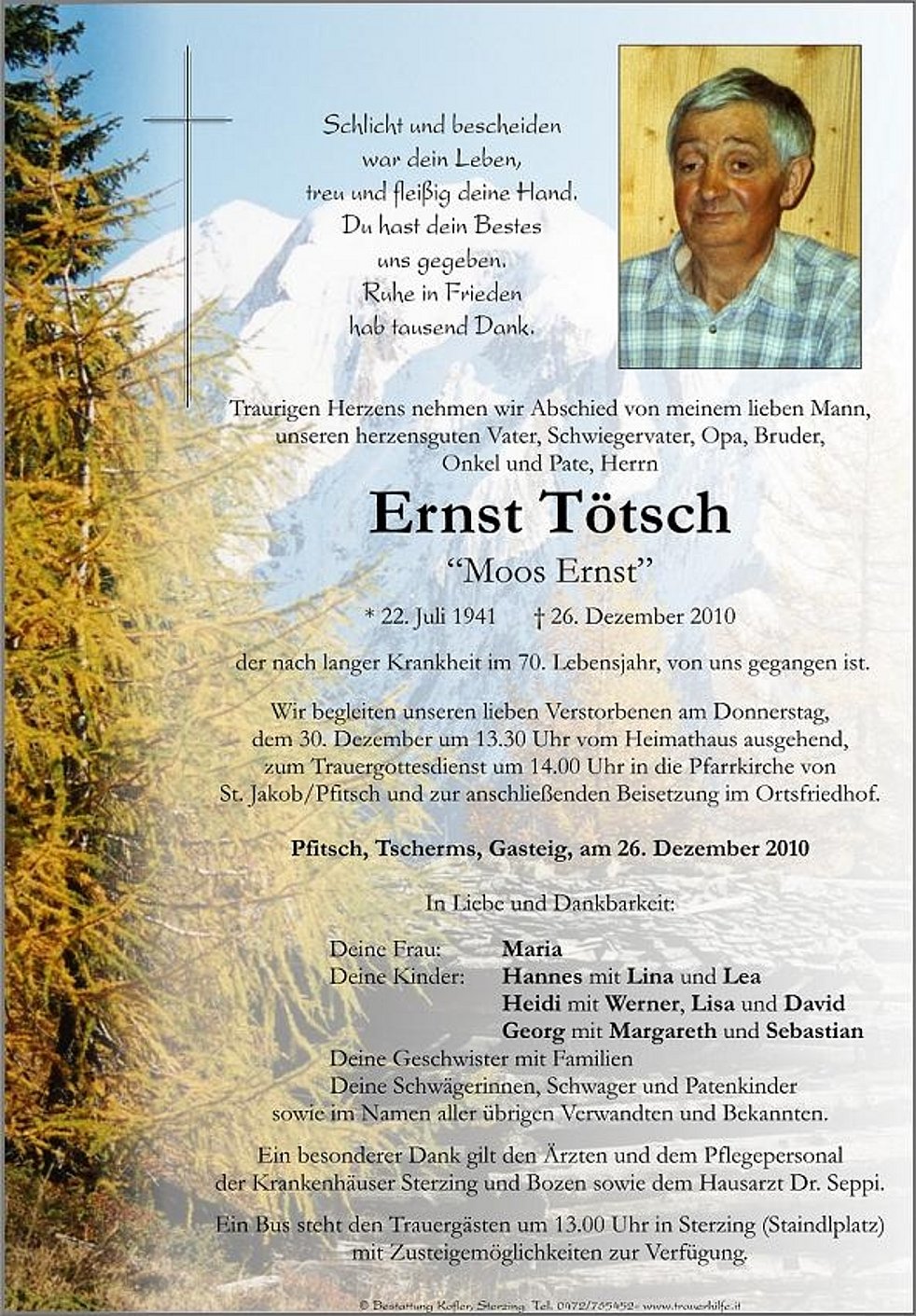in die Pfarrkirche von St. Jakob/Pfitsch und zur anschließenden Beisetzung im Ortsfriedhof.