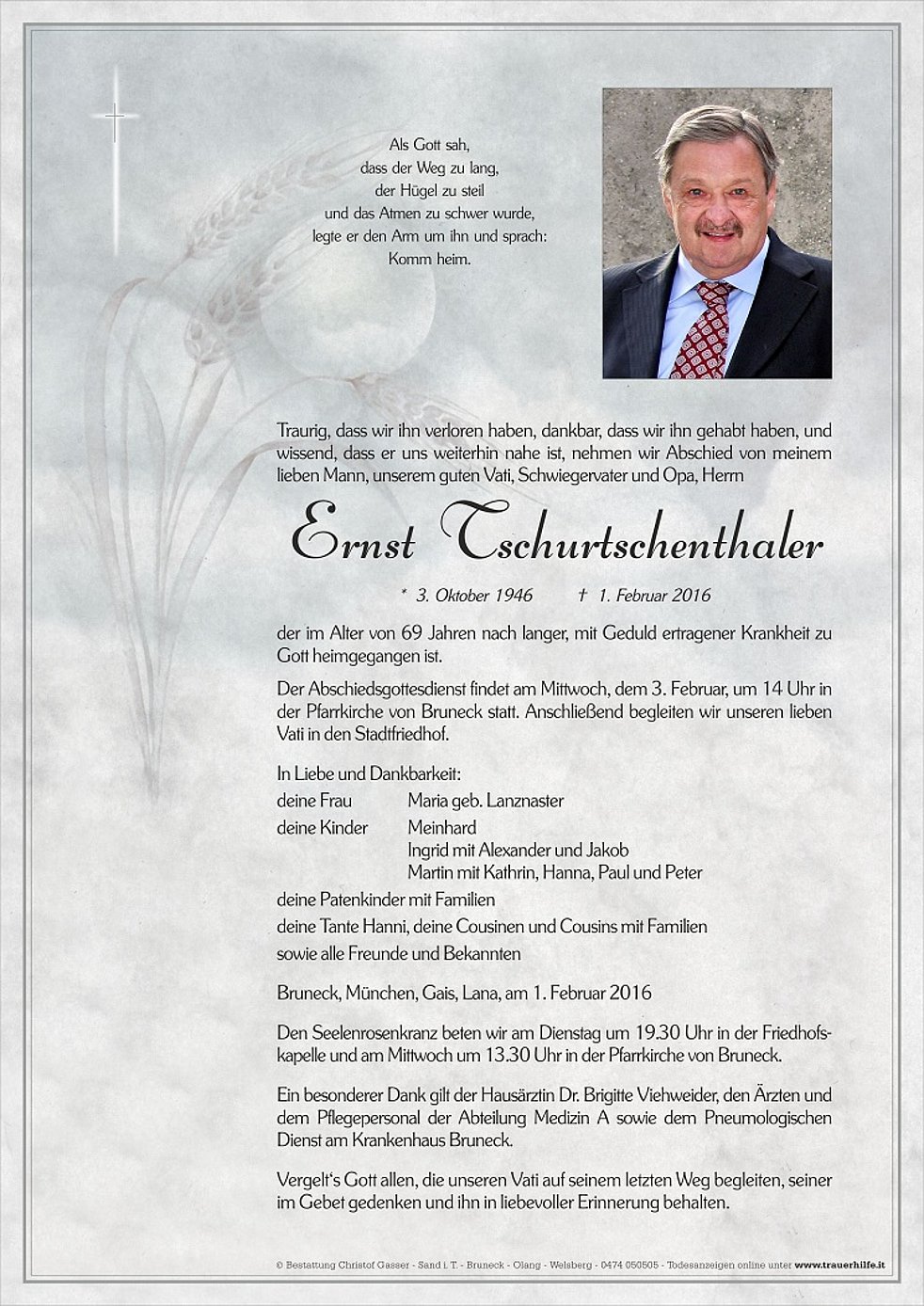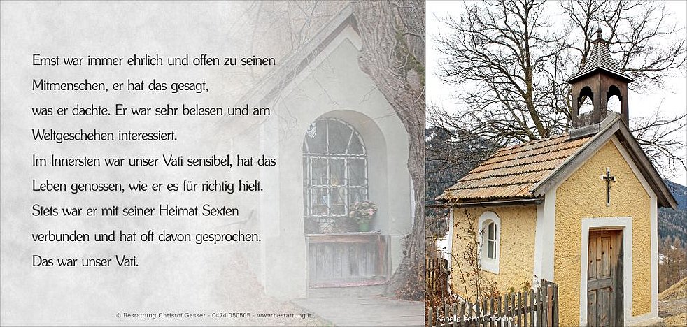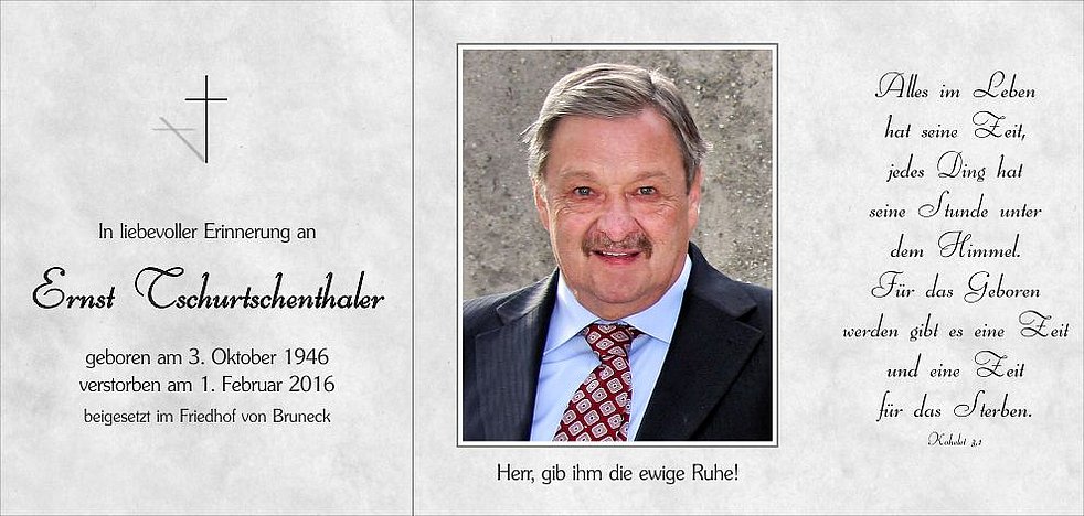 Der Abschiedsgottesdienst findet am Mittwoch, dem 3. Februar, um 14 Uhr in der Pfarrkirche von Bruneck statt. Anschließend begleiten wir unseren lieben Vati in den Stadtfriedhof.