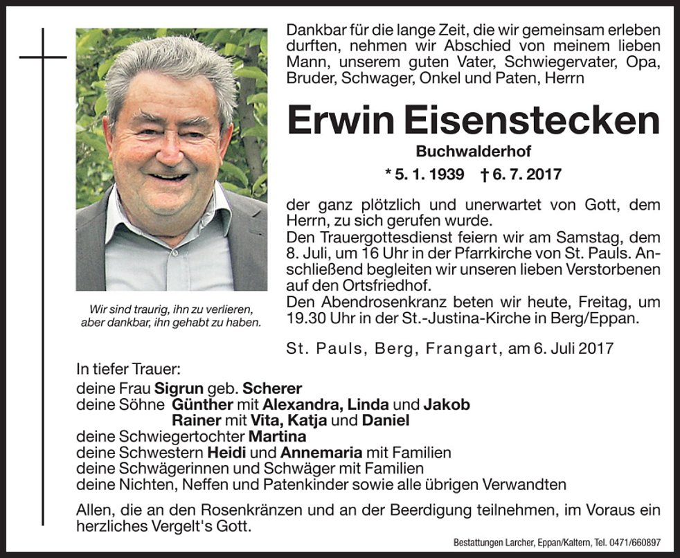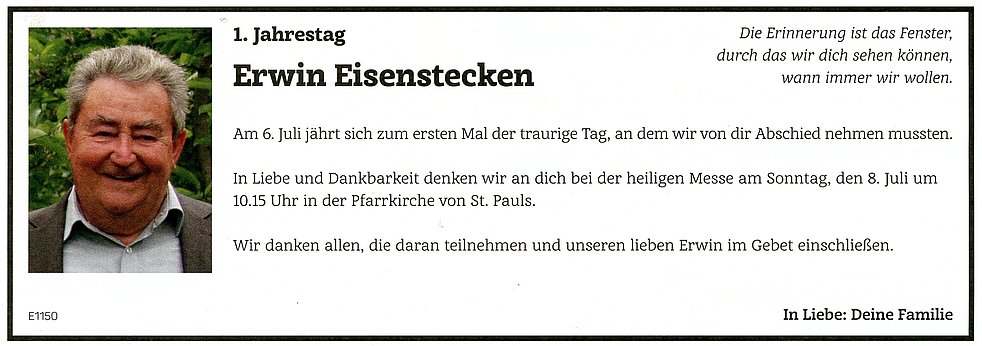 Den Trauergottesdienst feiern wir am Samstag dem 8. Juli um 16 Uhr in der Pfarrkirche von St. Pauls.