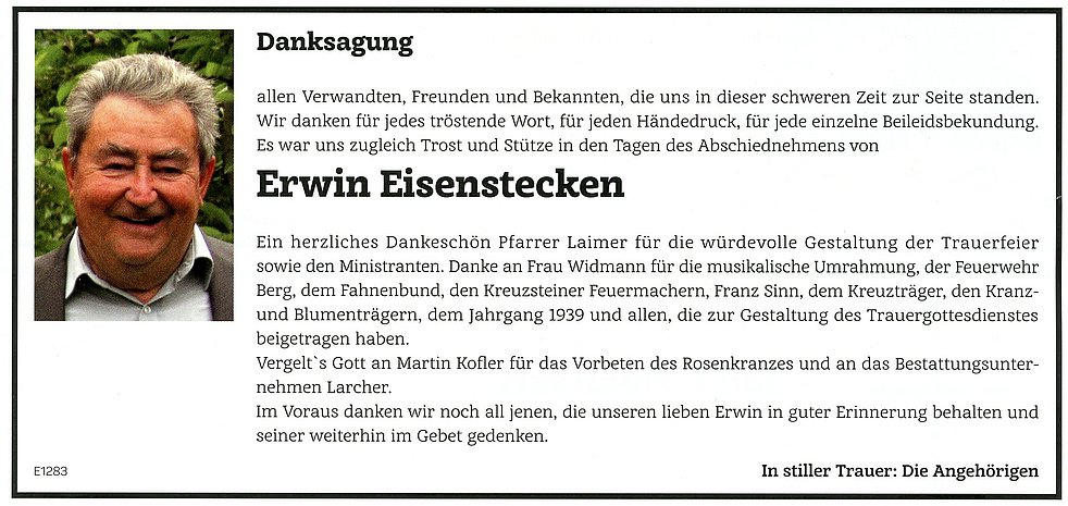 Allen die an den Rosenkränzen und an der Beerdigung teilnehmen im Voraus ein herzliches Vergelt`s Gott.