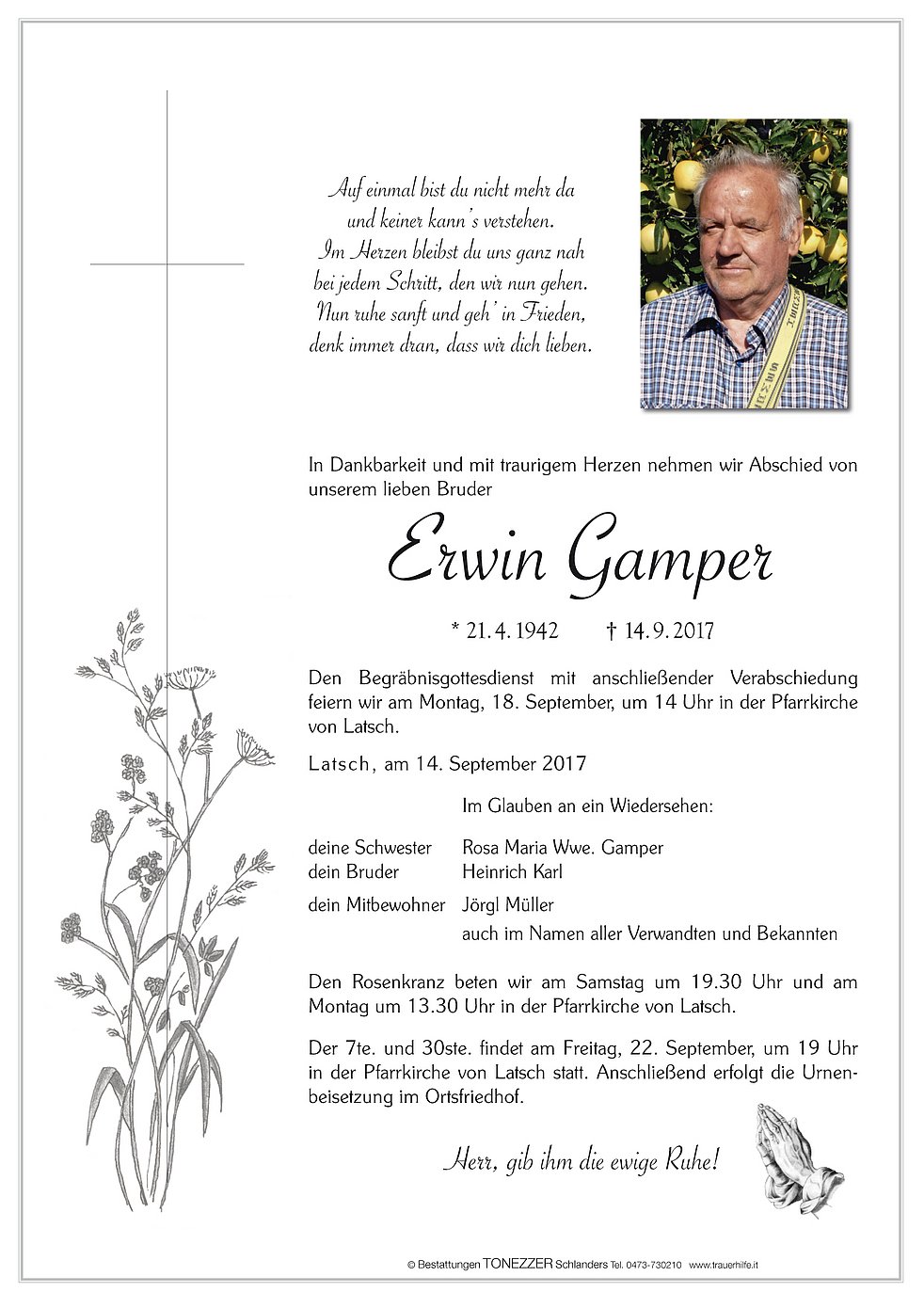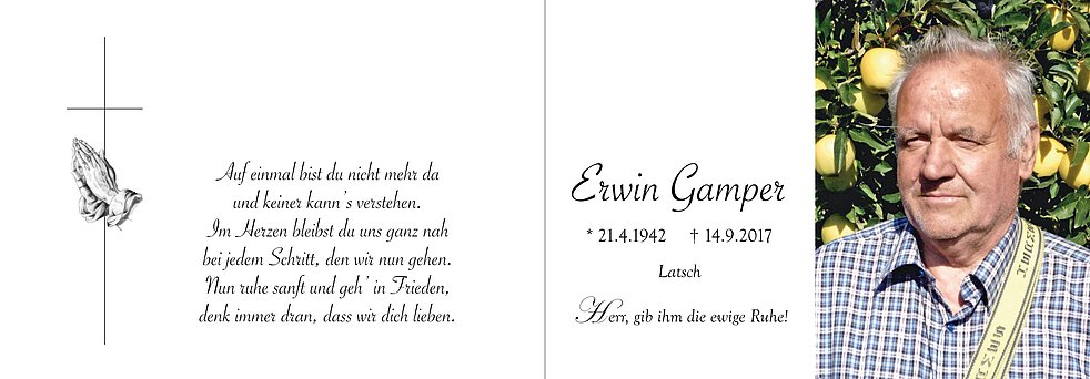 Den Begräbnisgottesdienst mit anschließender Verabschiedung feiern wir am Montag, 18. September, um 14 Uhr in der Pfarrkirche von Latsch.