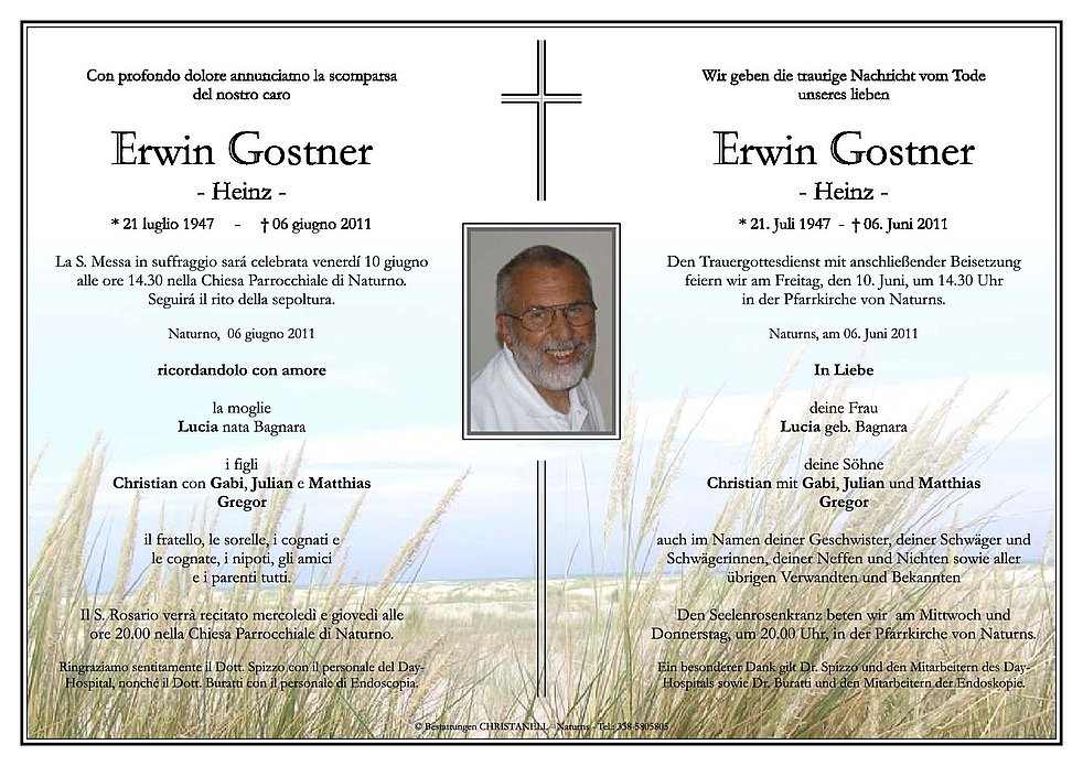 La S. Messa in suffraggio sará celebrata venerdí 10 giugno alle ore 14.30 nella Chiesa Parrocchiale di Naturno. Seguirá il rito della sepoltura.