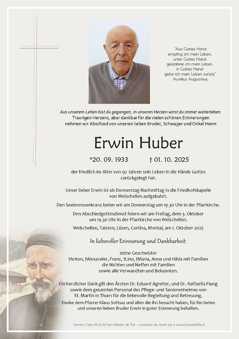 Lieber Erwin,du hast einige Jahre bei deiner Schwester Maria in Taisten gelebt und öfters sind wir uns über den Weg gelaufen oder du warst froh über eine Mitfahrgelegenheit. Bei diesen Gelegenheiten haben wir auch immer ein kurzes oder längeres Gespräch zusammen geführt und uns über dies und jenes unterhalten! Ich werde mich gerne an dich erinnern und wünsche dir Geborgenheit bei Gott und ein Wiedersehen mit deinen Lieben im Himmel.