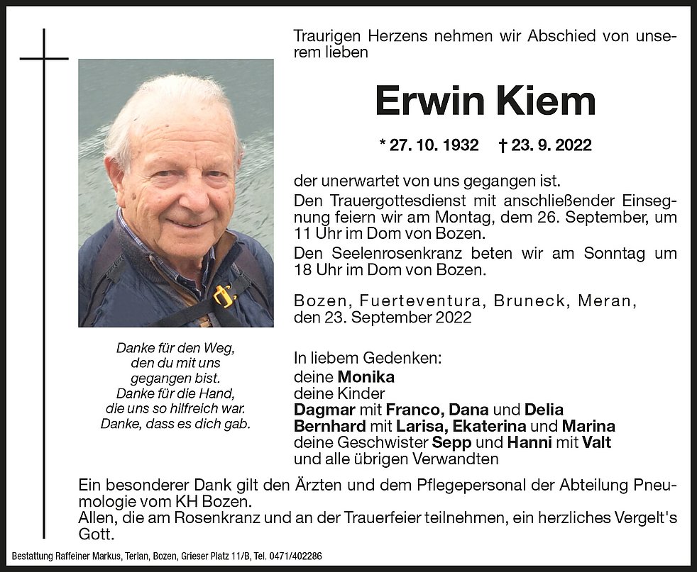 Den Trauergottesdienst mit anschließender Einsegnung feiern wir am Montag, dem 26. September, um 11 Uhr im Dom von Bozen.