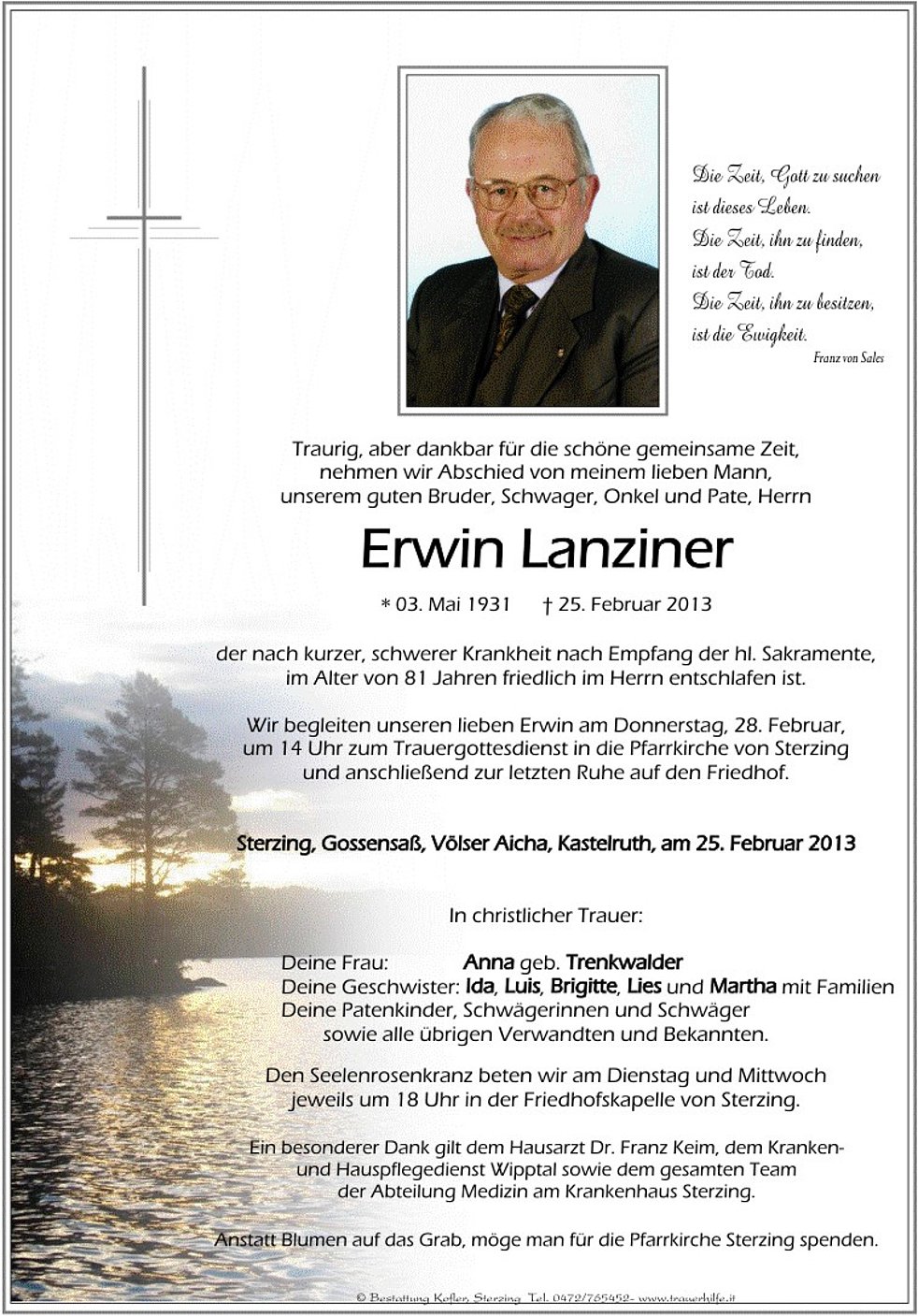 Anstatt Blumen auf das Grab, möge man für die Pfarrkirche Sterzing spenden.