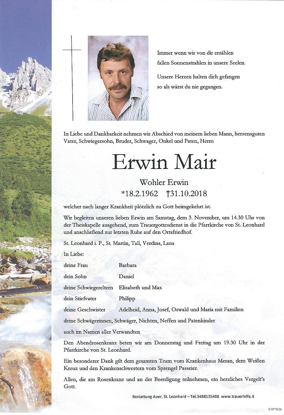 Wir begleiten unseren lieben Erwin am Samstag, dem 3. November, um 14.30 Uhr von der Theiskapelle ausgehend, zum Trauergottesdienst in die Pfarrkirche von St. Leonhard und anschließend zur letzten Ruhe auf den Ortsfriedhof.