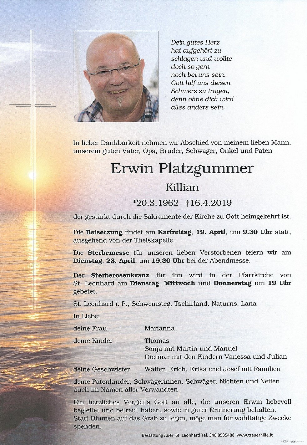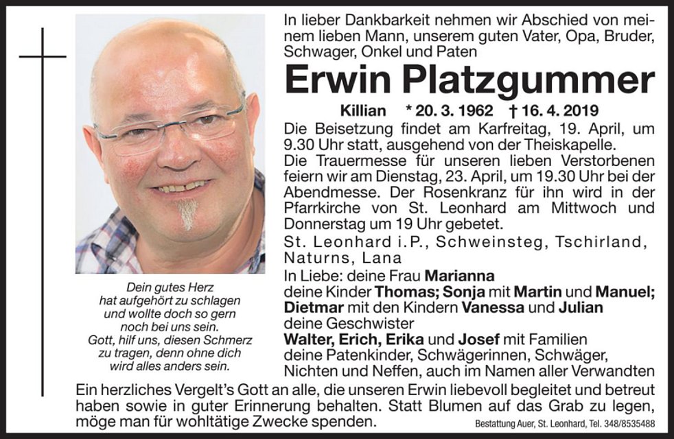 Ein herzliches Vergelt’s Gott an alle, die unseren Erwin liebevoll begleitet und betreut haben, sowie in guter Erinnerung behalten.