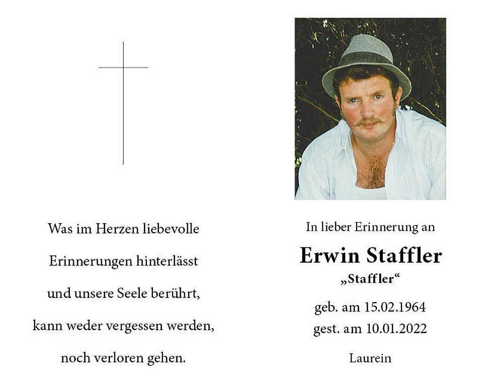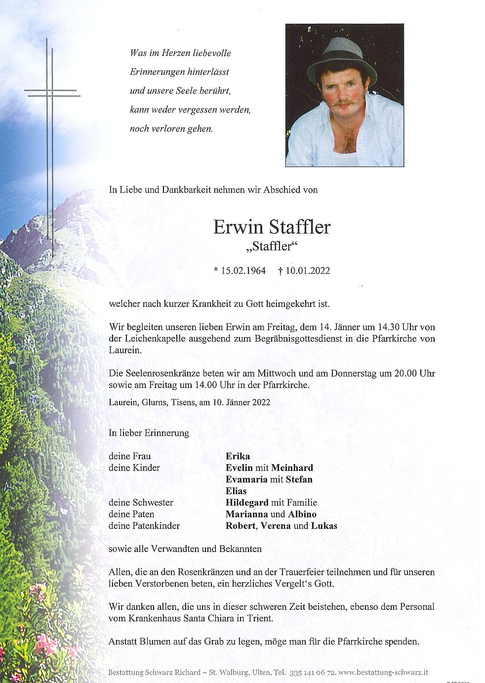 Wir begleiten unseren lieben Erwin am Freitag, dem 14. Jänner um 14.30 Uhr von der Leichenkapelle ausgehend zum Begräbnisgottesdienst in die Pfarrkirche von Laurein.
