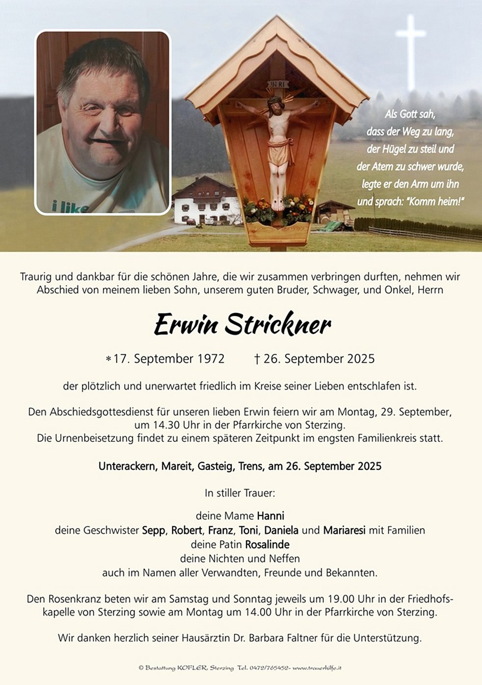 Den Abschiedsgottesdienst für unseren lieben Erwin feiern wir am Montag, 29. September, um 14.30 Uhr in der Pfarrkirche von Sterzing. Die Urnenbeisetzung findet zu einem späteren Zeitpunkt im engsten Familienkreis statt.