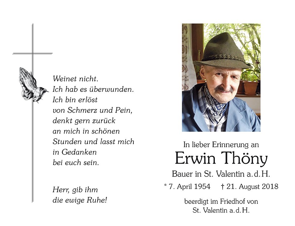 Wir begleiten unseren lieben Erwin am Freitag, 24. August, um 13.45 Uhr von der Leichenkapelle aus zur Einsegnung um 14 Uhr in die Pfarrkirche; anschließend Gottesdienst und Beisetzung im Ortsfriedhof von St. Valentin a.d.H.