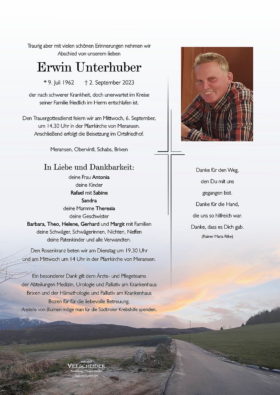 Liebe Tona mit Familie, liebe Barbara und Angehoerige! ...und doch ist einer der dieses Fallen unendlich sanft in seinen Haenden haelt. Viel zu frueh hot ihns do liebe Erwin verlossn. Des olle hobs jetz an lieben Engl und Fuerbitter oben im Himml. Er isch ollm in enkrigo Naehe. Tief betroffn vom ploerzlichn Tod megatn mir enk ihnso Beileid ausdruckn und enk olla gonz viel Kroft wuenschn. In Gedonkn ba enk Edith Schifferegger und Walter Eisenstecken.
