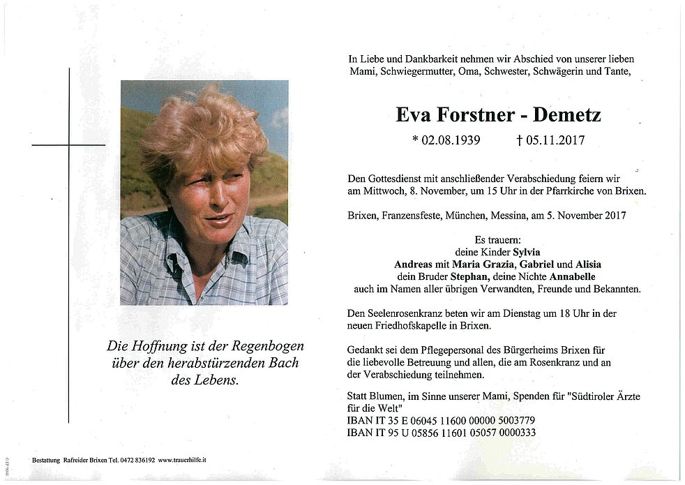 Statt Blumen, im Sinne unserer Mami, Spenden für "Südtiroler Ärzte für die Welt"