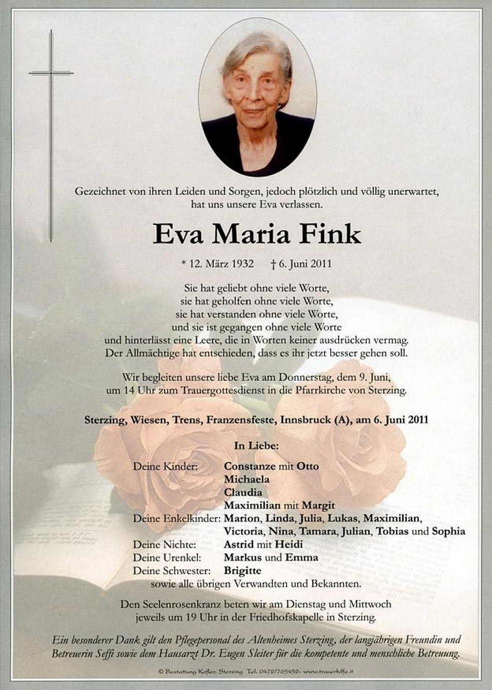 Ein besonderer Dank gilt den Pflegepersonal des Altenheimes Sterzing, der langjährigen Freundin und Betreuerin Seffi sowie dem Hausarzt Dr. Eugen Sleiter für die kompetente