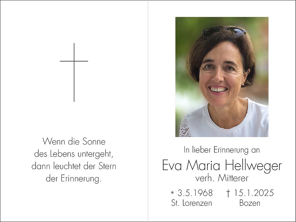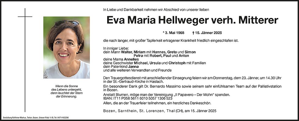 Anstatt Blumen, möge man der Vereinigung „Il Papavero – Der Mohn“ spenden. IBAN: IT11 P058 5611 6010 5057 1306 523