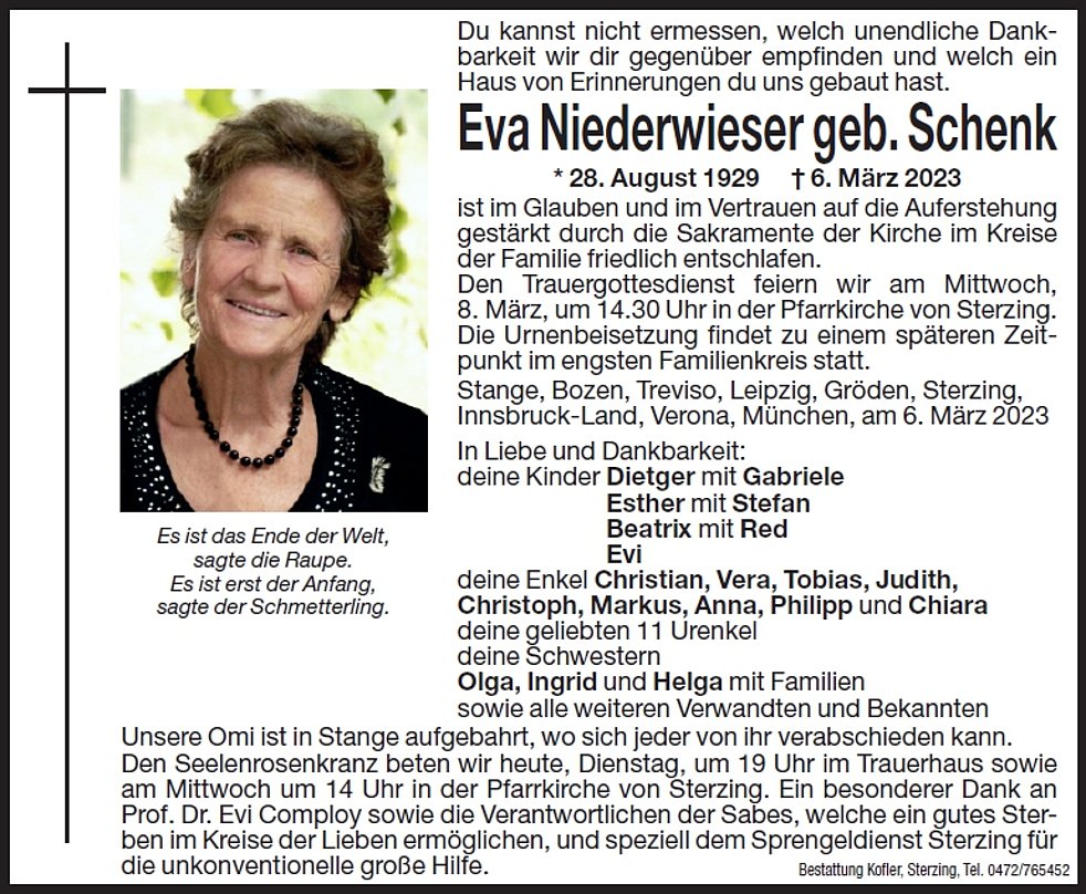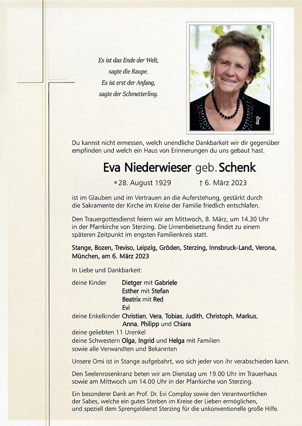 Den Trauergottesdienst feiern wir am Mittwoch, 8. März, um 14.30 Uhr in der Pfarrkirche von Sterzing. Die Urnenbeisetzung findet zu einem späteren Zeitpunkt im engsten Familienkreis statt.