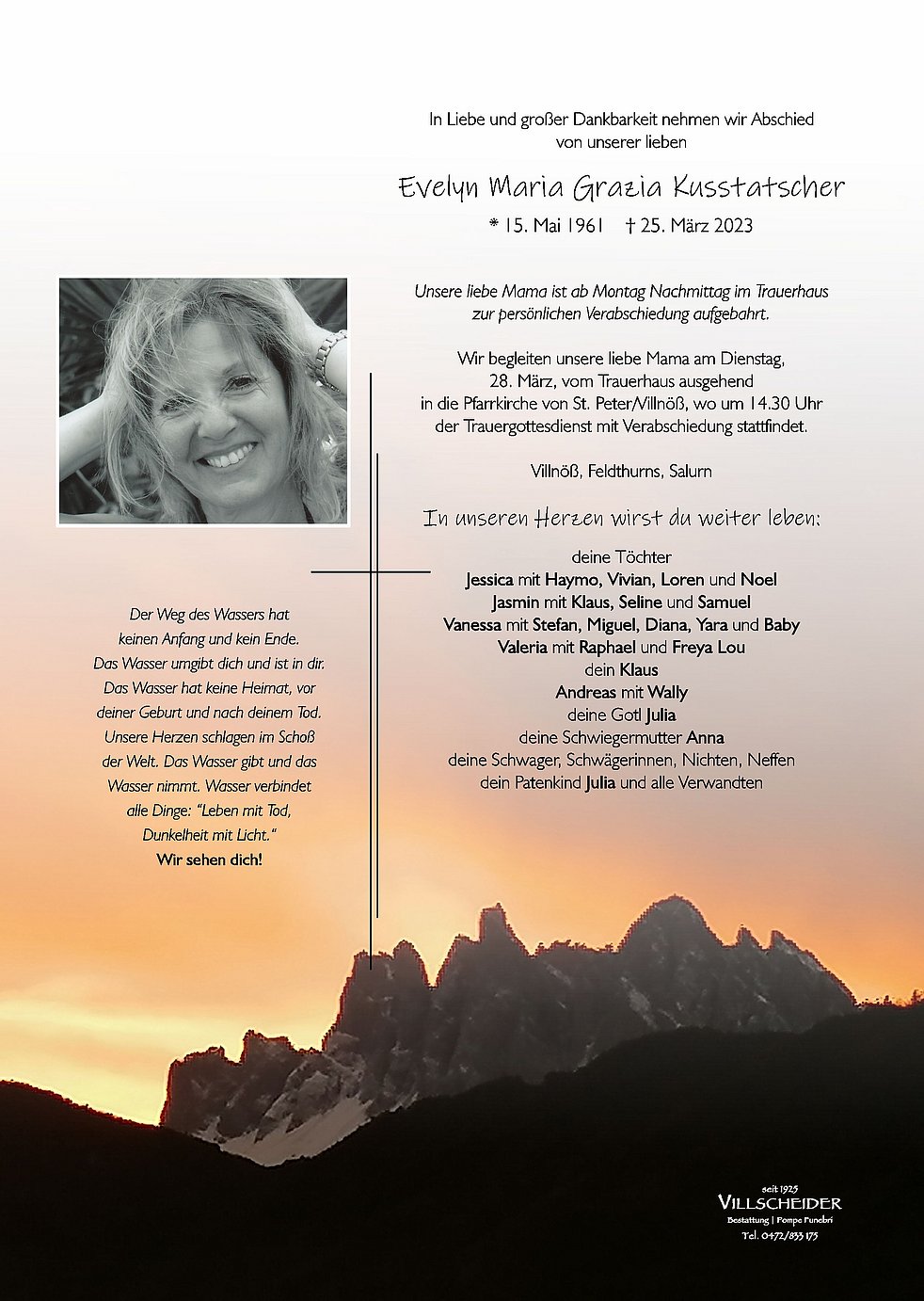 Na Evelin i konns net glab, des mocht mie echt traurig, honn olm so gern mit dir an Ratscher gemocht, deine Herzlichkeit wor so ansteckend, DIR wünsch i a gute Reise und deinen Madlen ganz viel Kraft, hoff sie hobn viele liebe Menschen, dei sie iaz in der schweren Zeit begleiten, Pfiati Evelyn