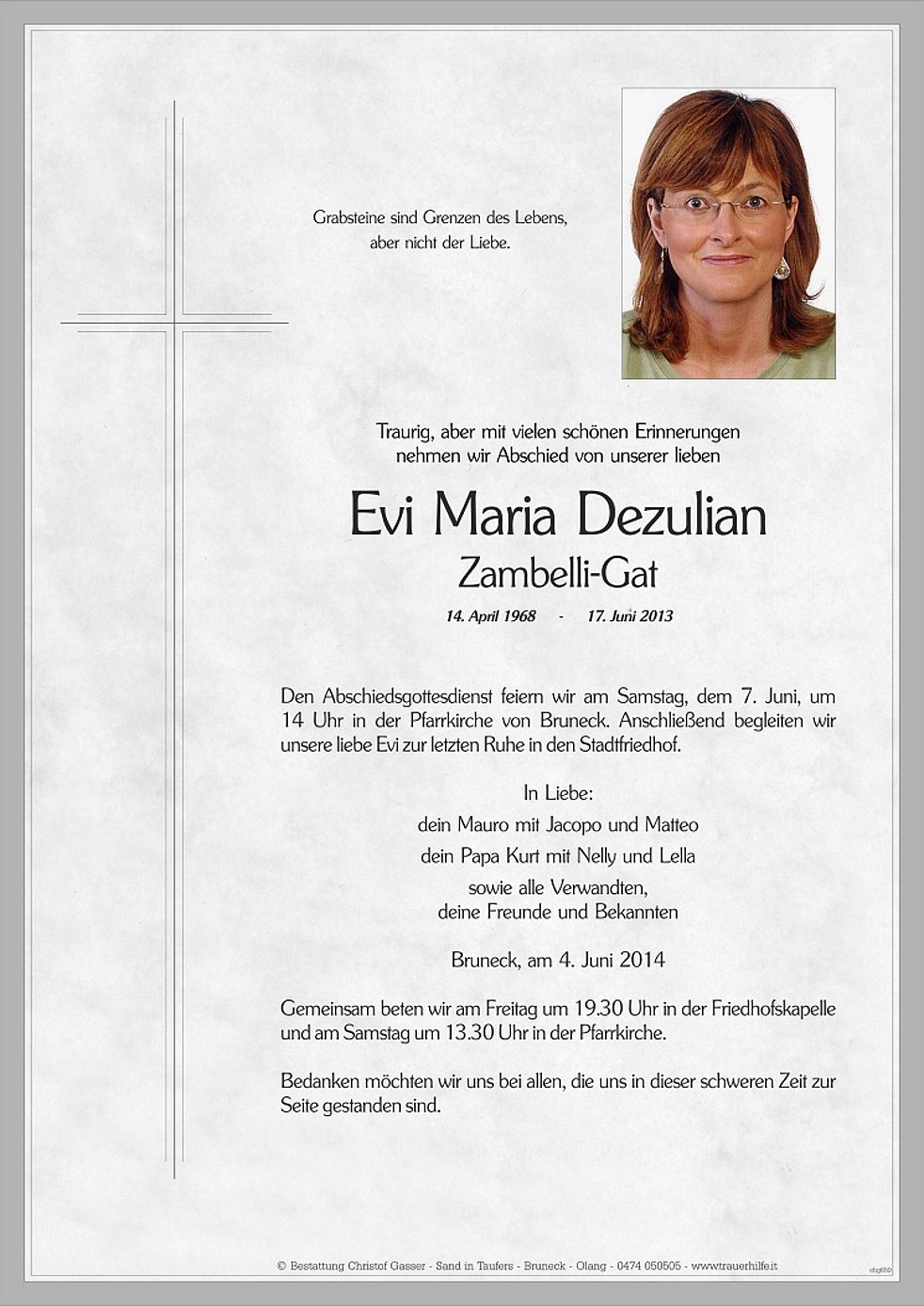 14 Uhr in der Pfarrkirche von Bruneck. Anschließend begleiten wir unsere liebe Evi zur letzten Ruhe in den Stadtfriedhof.