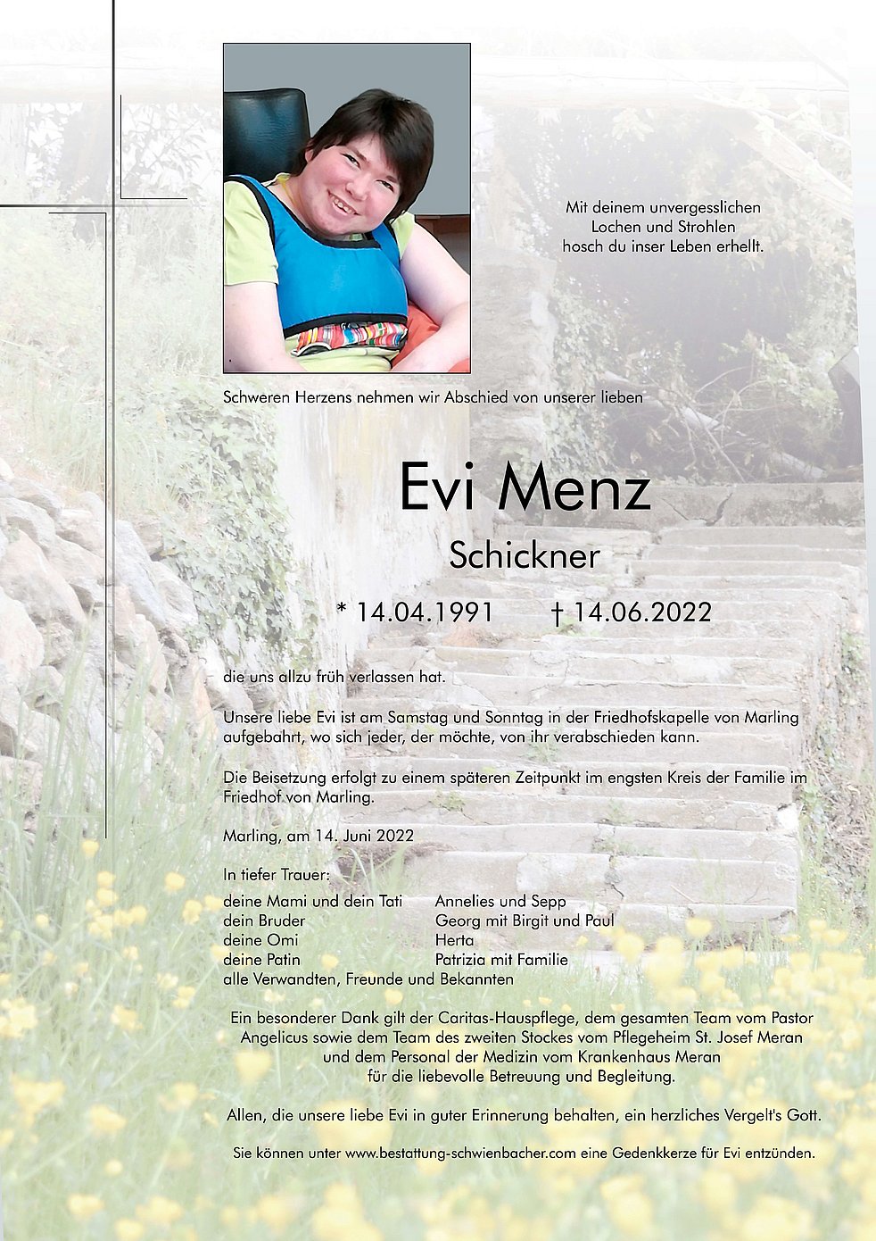 Liebe Evi, ich durfte dich einen kleinen Abschnitt deines Lebens als Lehrerin begleiten. Es war eine intensive, oft auch herausfordernde Zeit, aber sie war auch sehr schön. Du hast Spuren in meinem Herzen hinterlassen, die unauslöschbar sind. Schaue auf deine Eltern und deinen Bruder, die dich sicher sehr vermissen werden.