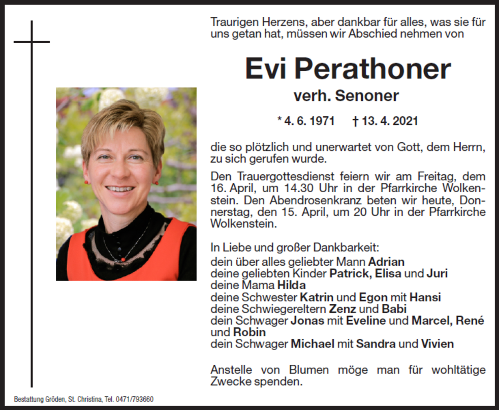 Den Trauergottesdienst feiern wir am Freitag, dem 16. April, um 14:30 Uhr in der Pfarrkirche von Wolkenstein.