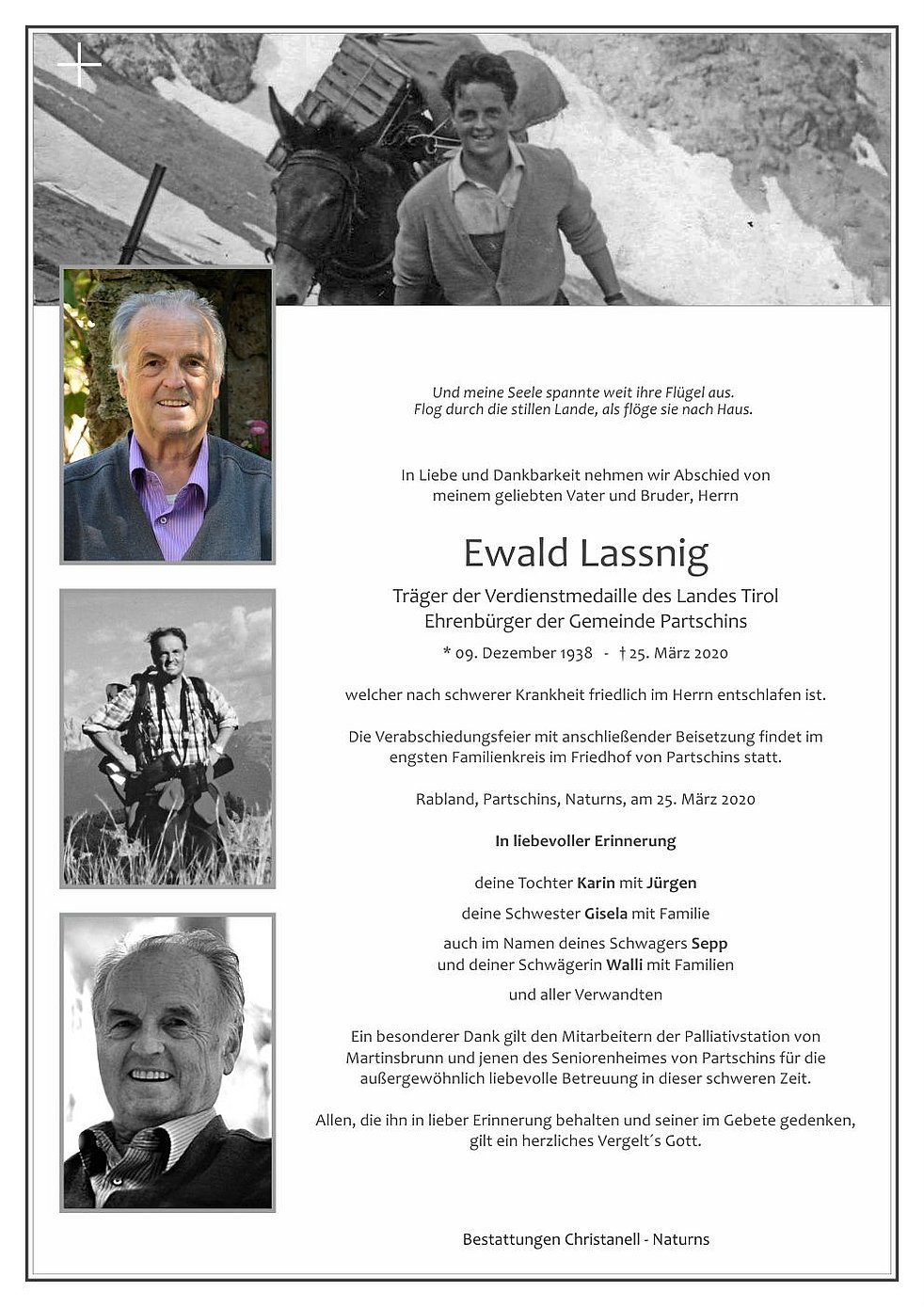 Die Verabschiedungsfeier mit anschließender Beisetzung findet im engsten Familienkreis im Friedhof von Partschins statt.