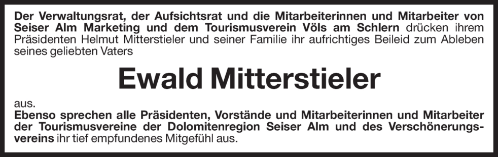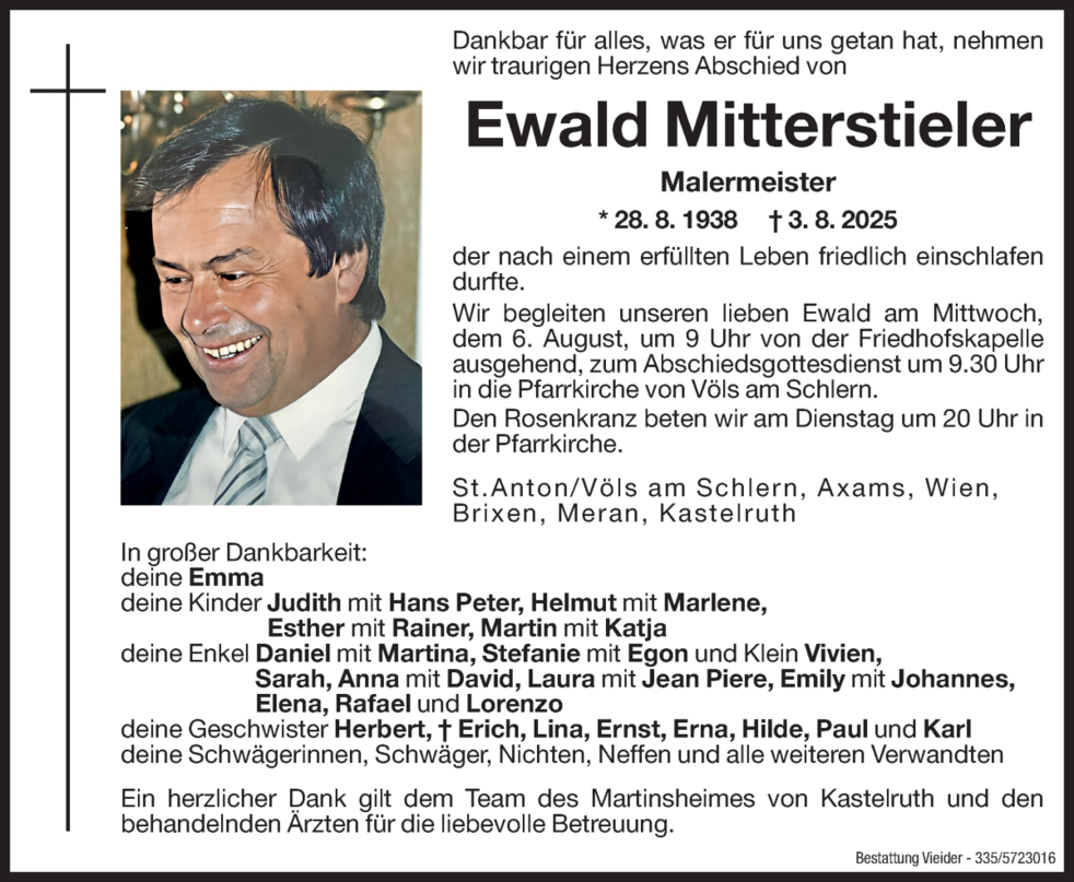 Wir begleiten unseren lieben Ewald am Mittwoch, dem 6. August, um 9 Uhr von der Friedhofskapelle ausgehend, zum Abschiedsgottesdienst um 9.30 Uhr in die Pfarrkirche von Völs am Schlern.