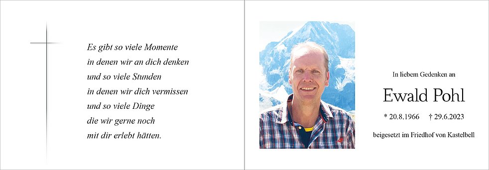 Die Verabschiedung mit anschließender Urnenbeisetzung findet im engsten Familienkreis im Ortsfriedhof von Kastelbell statt.