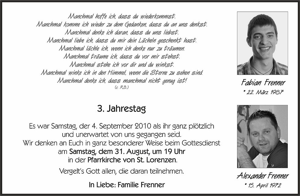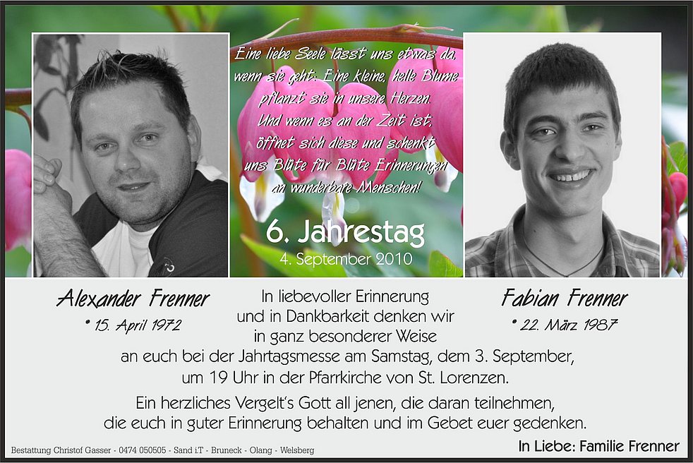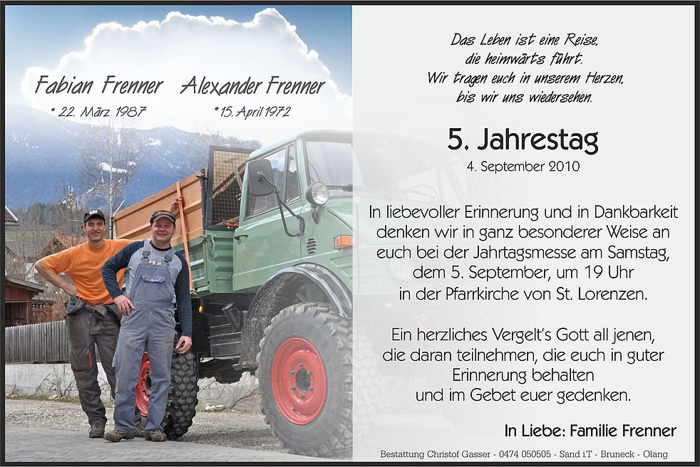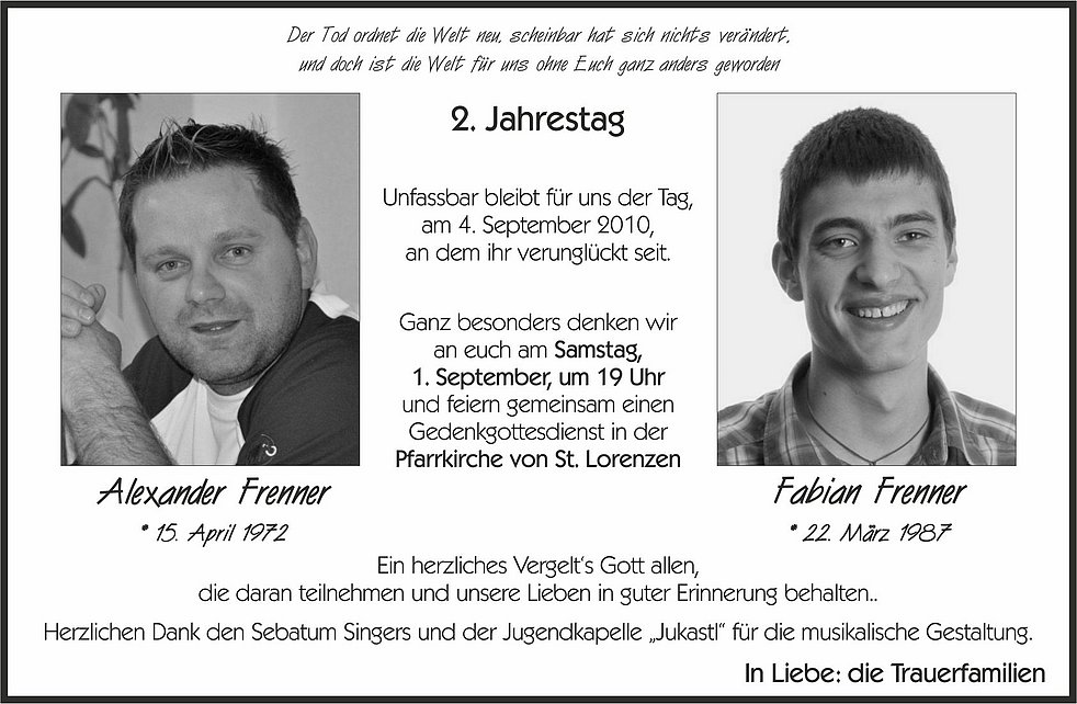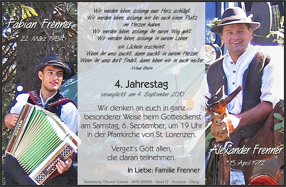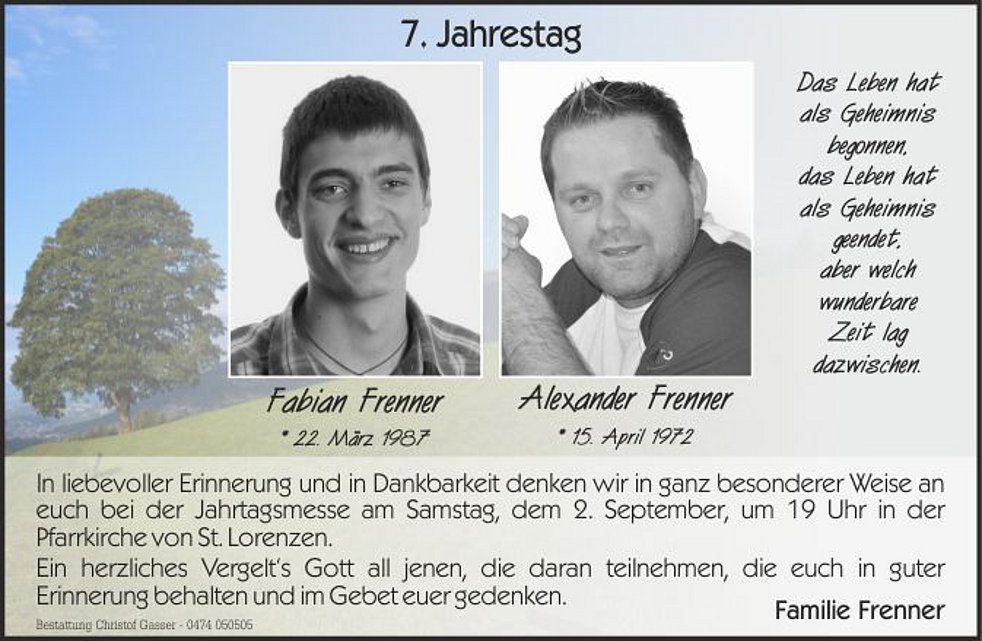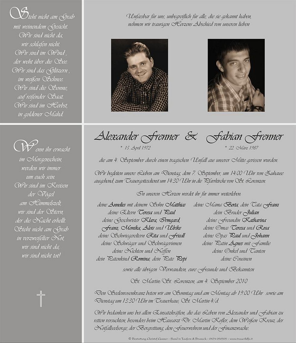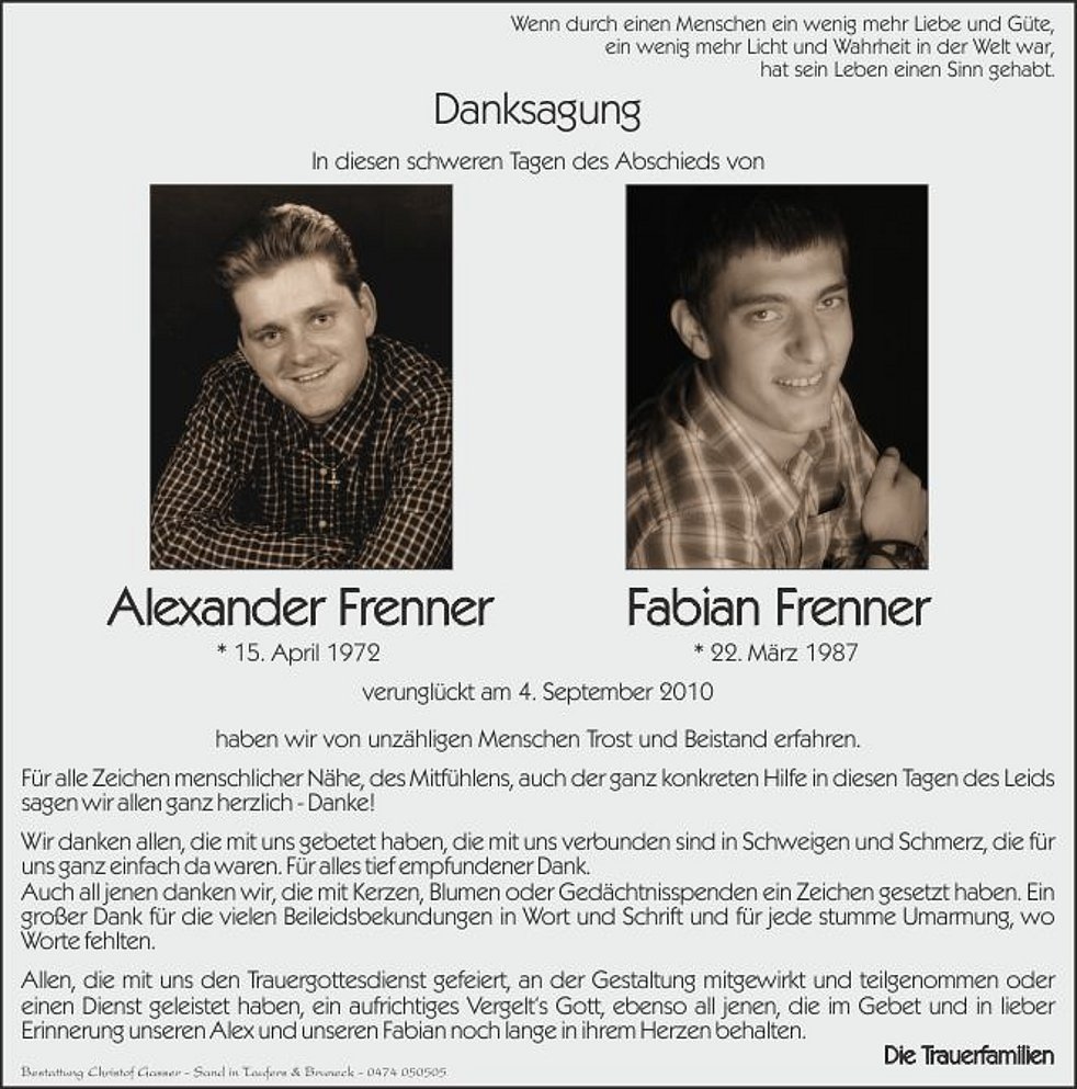 Wir bedanken uns bei allen Einsatzkräften, die das Leben von Alexander und Fabian zu retten versuchten, besonders beim Hausarzt Dr. Martin Kofler, dem Weißen Kreuz, der Notfallseelsorge, der Bergrettung, den Feuerwehren und der Finanzwache.