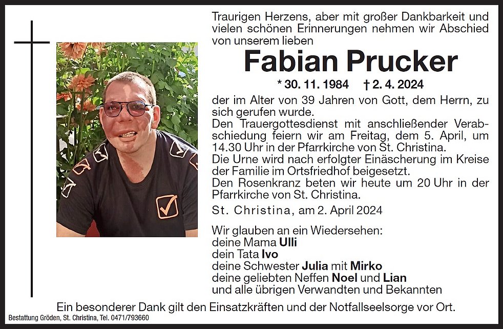 Den Trauergottesdienst mit anschließender Verabschiedung feiern wir am Freitag, dem 05. April, um 14.30 Uhr in der Pfarrkirche von St. Christina. Die Urne wird nach erfolgter Einäscherung im Kreise der Familie im Ortsfriedhof beigesetzt.