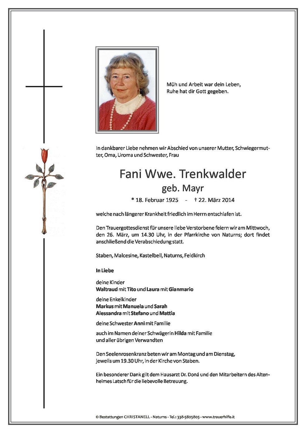 Den Trauergottesdienst für unsere liebe Verstorbene feiern wir am Mittwoch, den 26. März, um 14.30 Uhr, in der Pfarrkirche von Naturns; dort findet anschließend die Verabschiedung statt.
