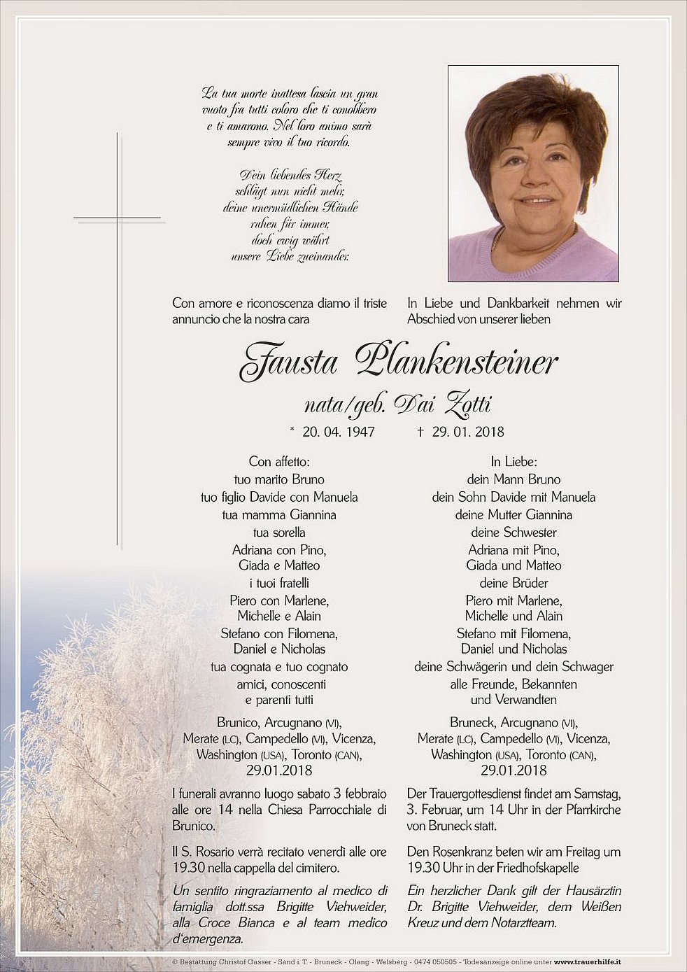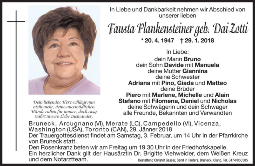 Der Trauergottesdienst findet am Samstag, 3. Februar, um 14 Uhr in der Pfarrkirche von Bruneck statt.