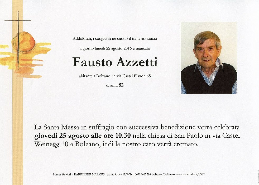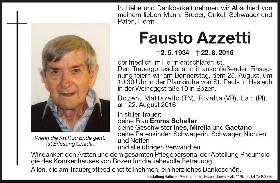 Den Trauergottesdienst mit anschließender Einsegnung feiern wir am Donnerstag, den 25. August, um 10.30 Uhr in der Pfarrkirche von St. Pauls in Haslach in der Weineggstraße 10 in Bozen.