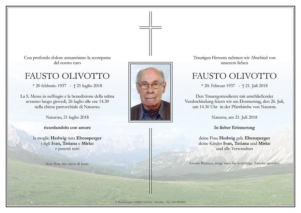 Den Trauergottesdienst mit anschließender Verabschiedung feiern wir am Donnerstag, den 26. Juli, um 14.30 Uhr in der Pfarrkirche von Naturns.