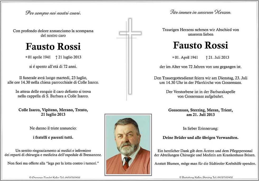 Anstatt Blumen, möge man für die Südtiroler Krebshilfe spenden.