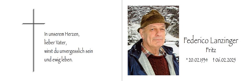 Den Trauergottesdienst mit anschließender Verabschiedung feiern wir am Samstag, dem 08. Februar, um 14.30 Uhr in der Pfarrkirche von Wolkenstein. Die Urne wird nach erfolgter Einäscherung im Kreise der Familie im Ortsfriedhof beigesetzt.