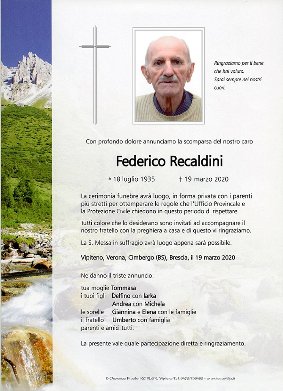 La cerimonia funebre avrà luogo, in forma privata con i parenti piú stretti per ottemperare le regole che l‘Ufficio Provincale e la Protezione Civile chiedono in questo periodo di rispettare.