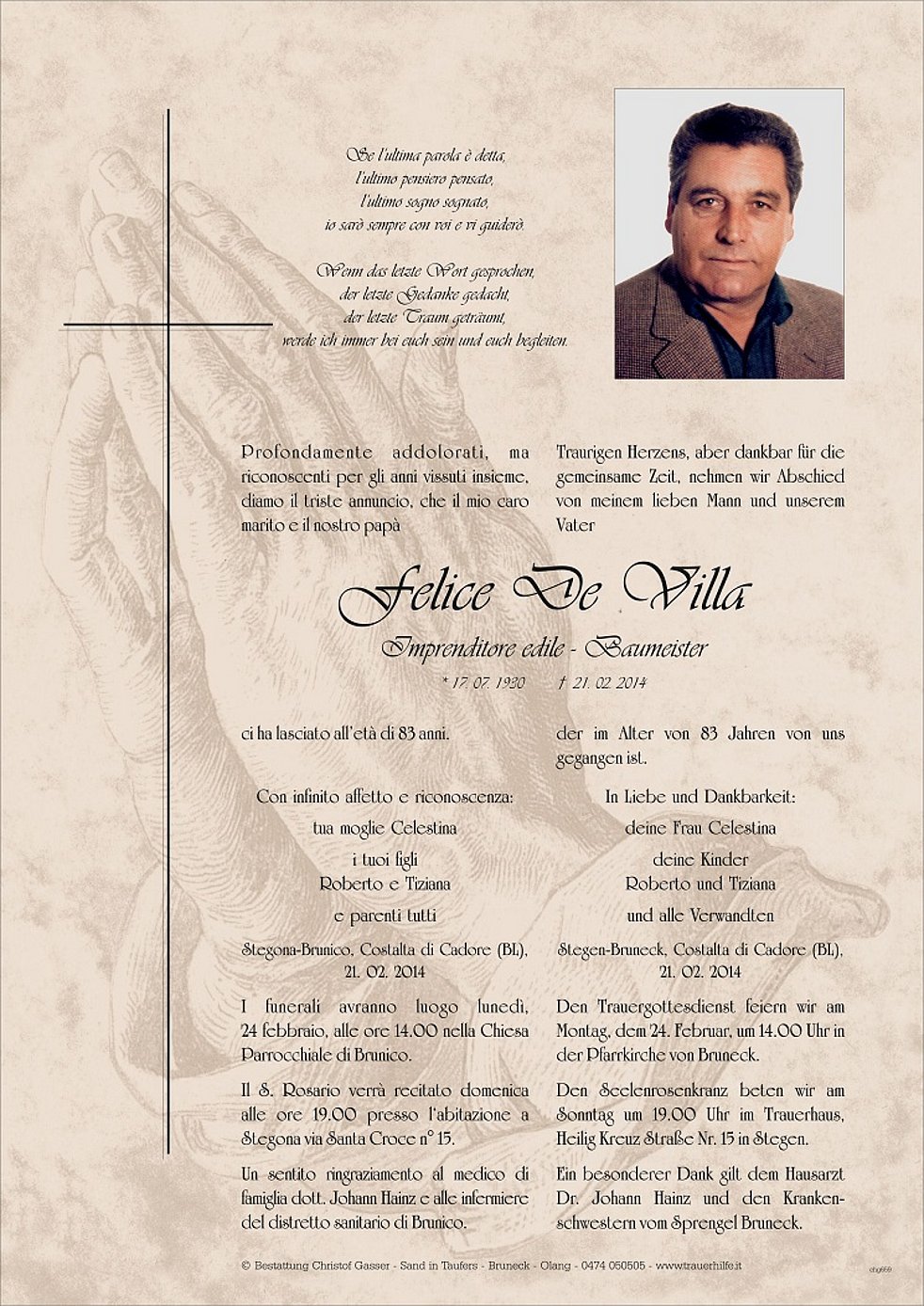 Den Trauergottesdienst feiern wir am Montag, dem 24. Februar, um 14.00 Uhr in der Pfarrkirche von Bruneck.