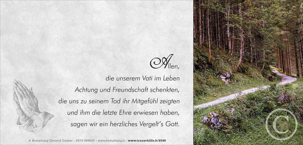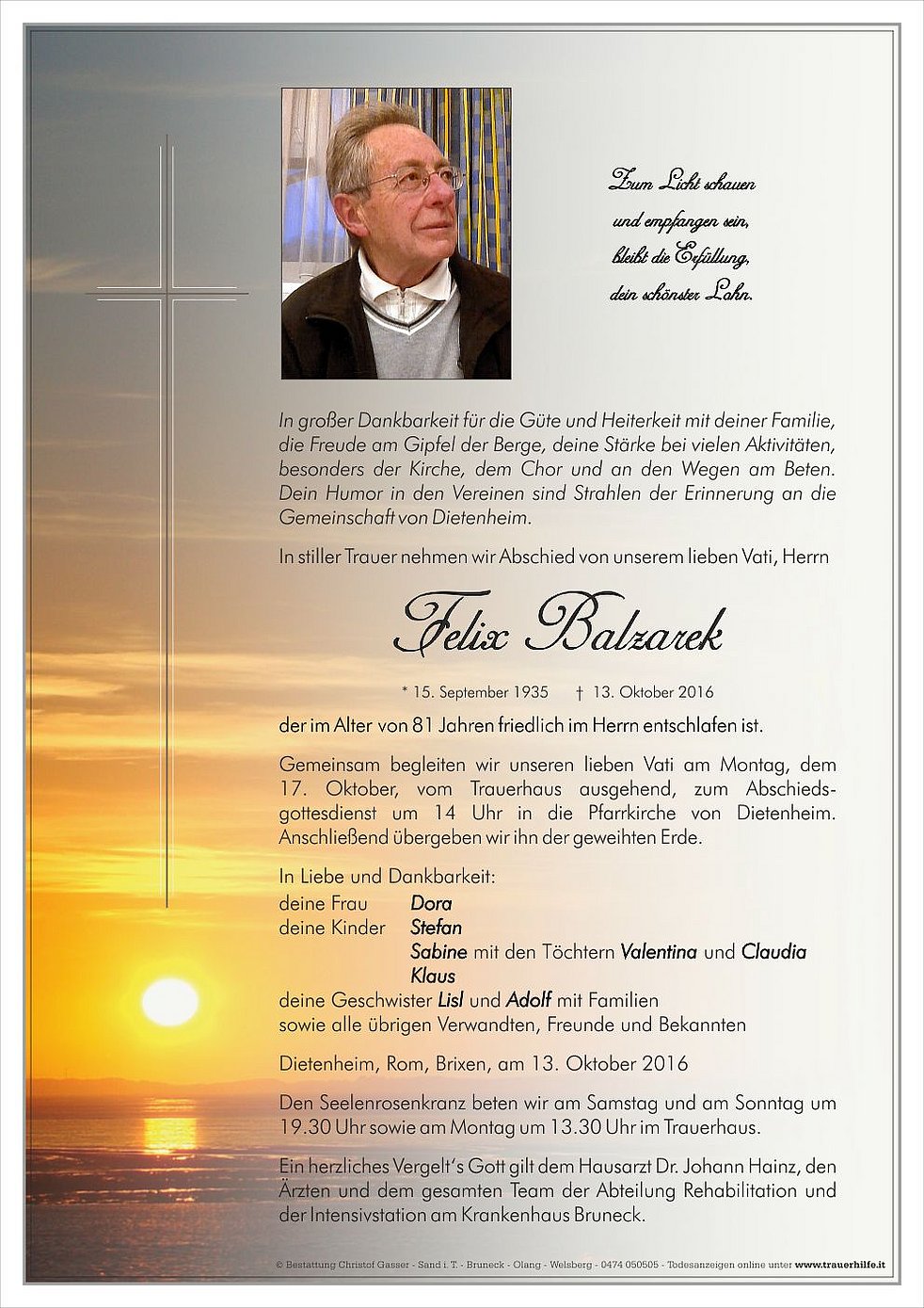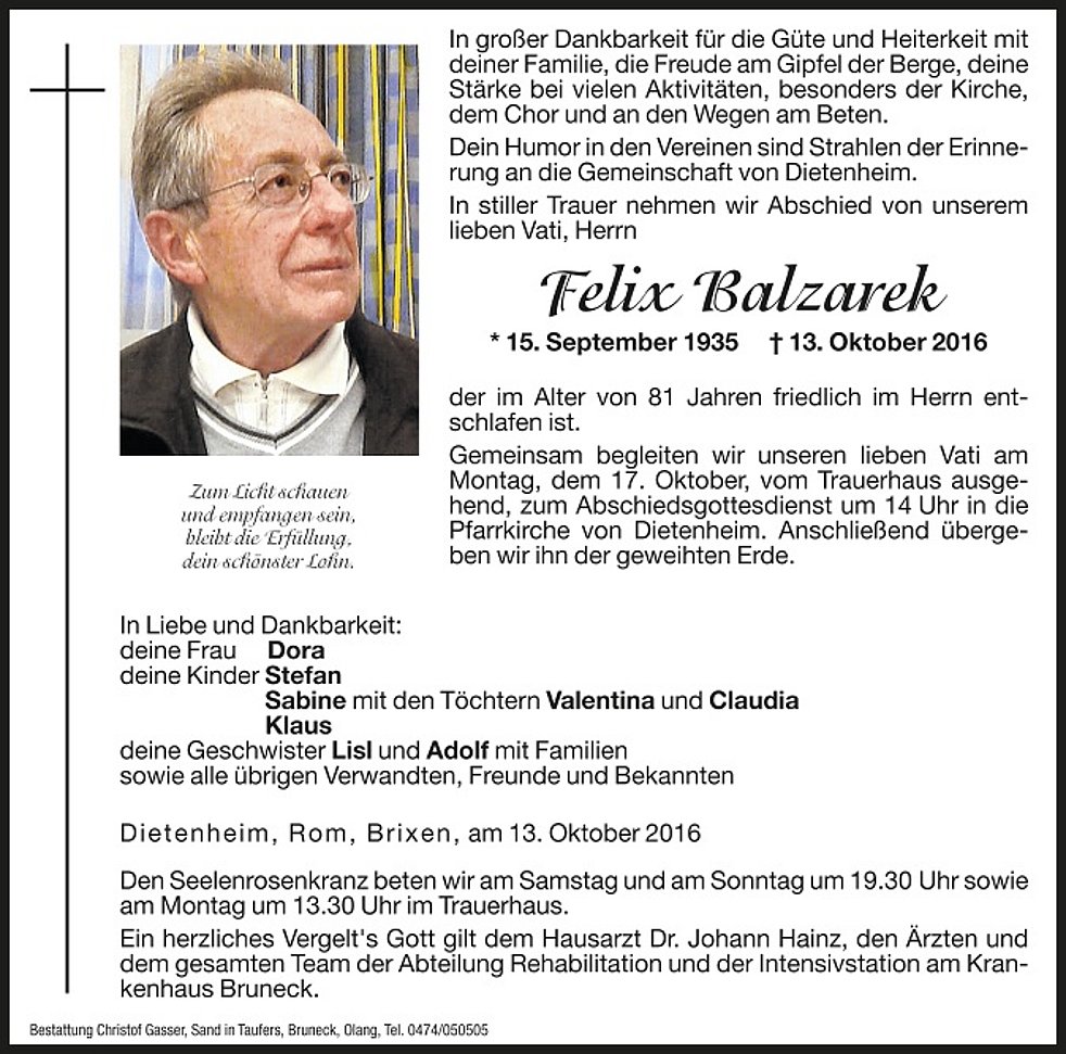 In großer Dankbarkeit für die Güte und Heiterkeit mit deiner Familie, die Freude am Gipfel der Berge, deine Stärke bei vielen Aktivitäten, besonders der Kirche, dem Chor und an den Wegen am Beten. Dein Humor in den Vereinen sind Strahlen der Erinnerung an die Gemeinschaft von Dietenheim.