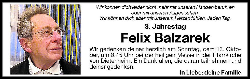 Gemeinsam begleiten wir unseren lieben Vati am Montag, dem 17. Oktober, vom Trauerhaus ausgehend, zum Abschieds-gottesdienst um 14 Uhr in die Pfarrkirche von Dietenheim. Anschließend übergeben wir ihn der geweihten Erde.