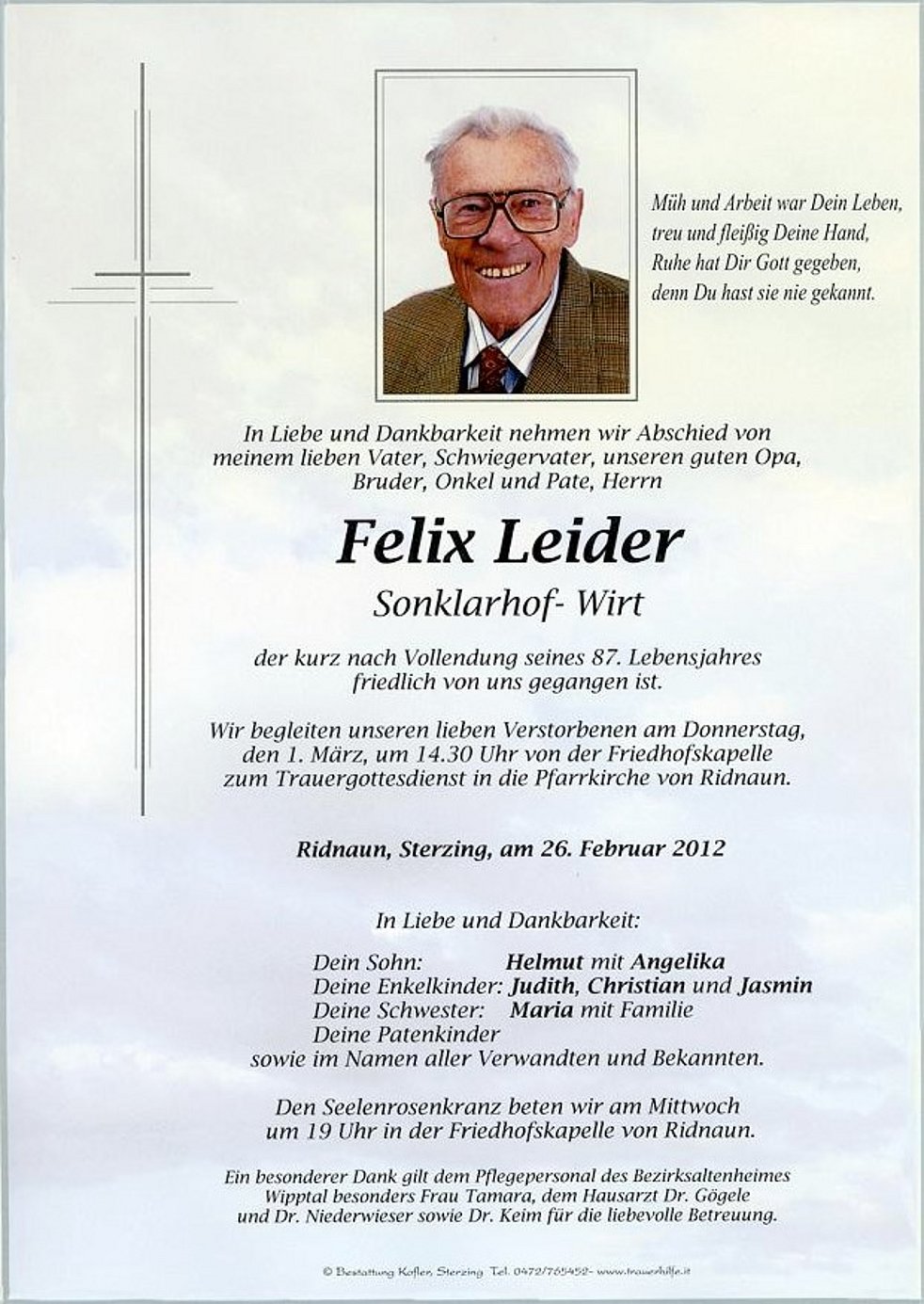 Wir begleiten unseren lieben Verstorbenen am Donnerstag, den 1. März, um 14.30 Uhr