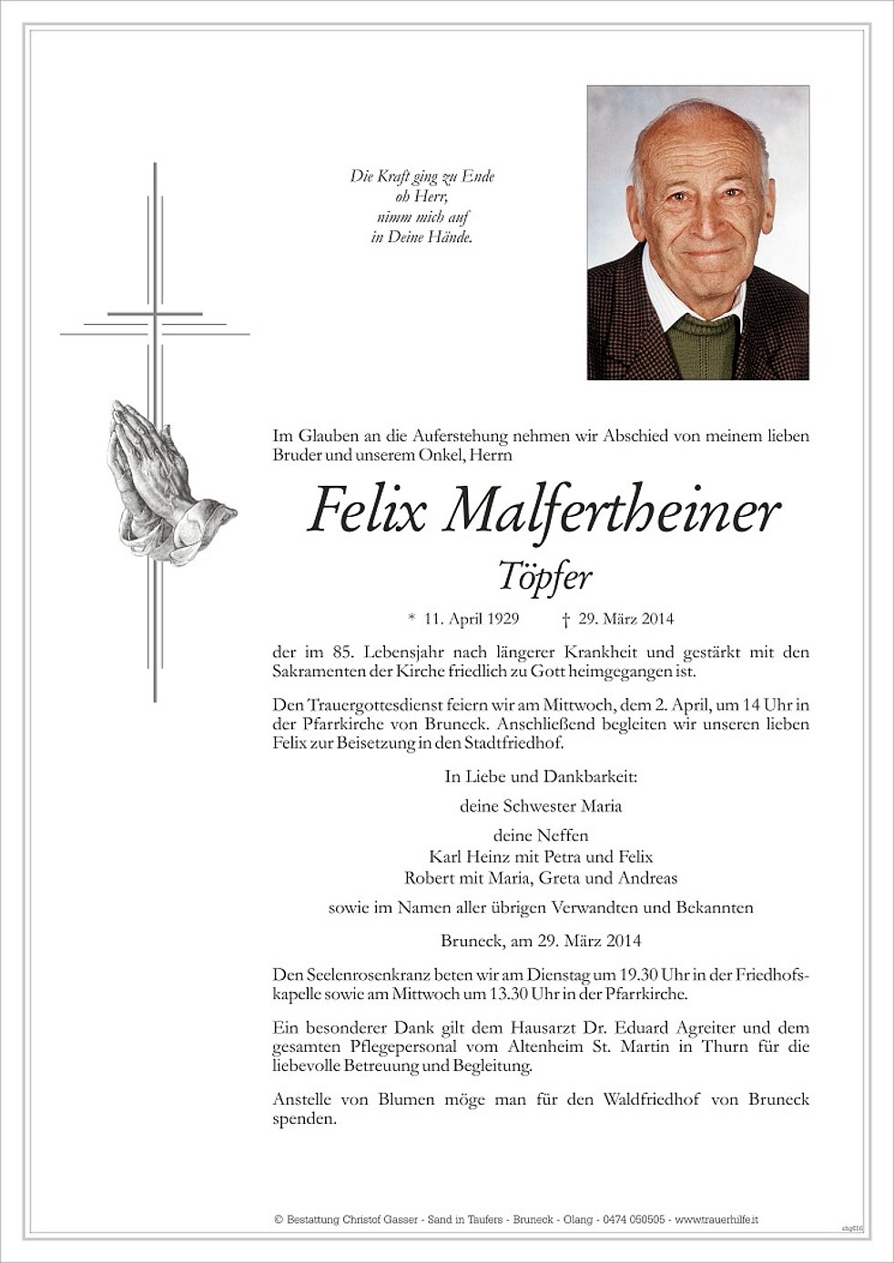 Den Trauergottesdienst feiern wir am Mittwoch, dem 2. April, um 14 Uhr in der Pfarrkirche von Bruneck. Anschließend begleiten wir unseren lieben Felix zur Beisetzung in den Stadtfriedhof.